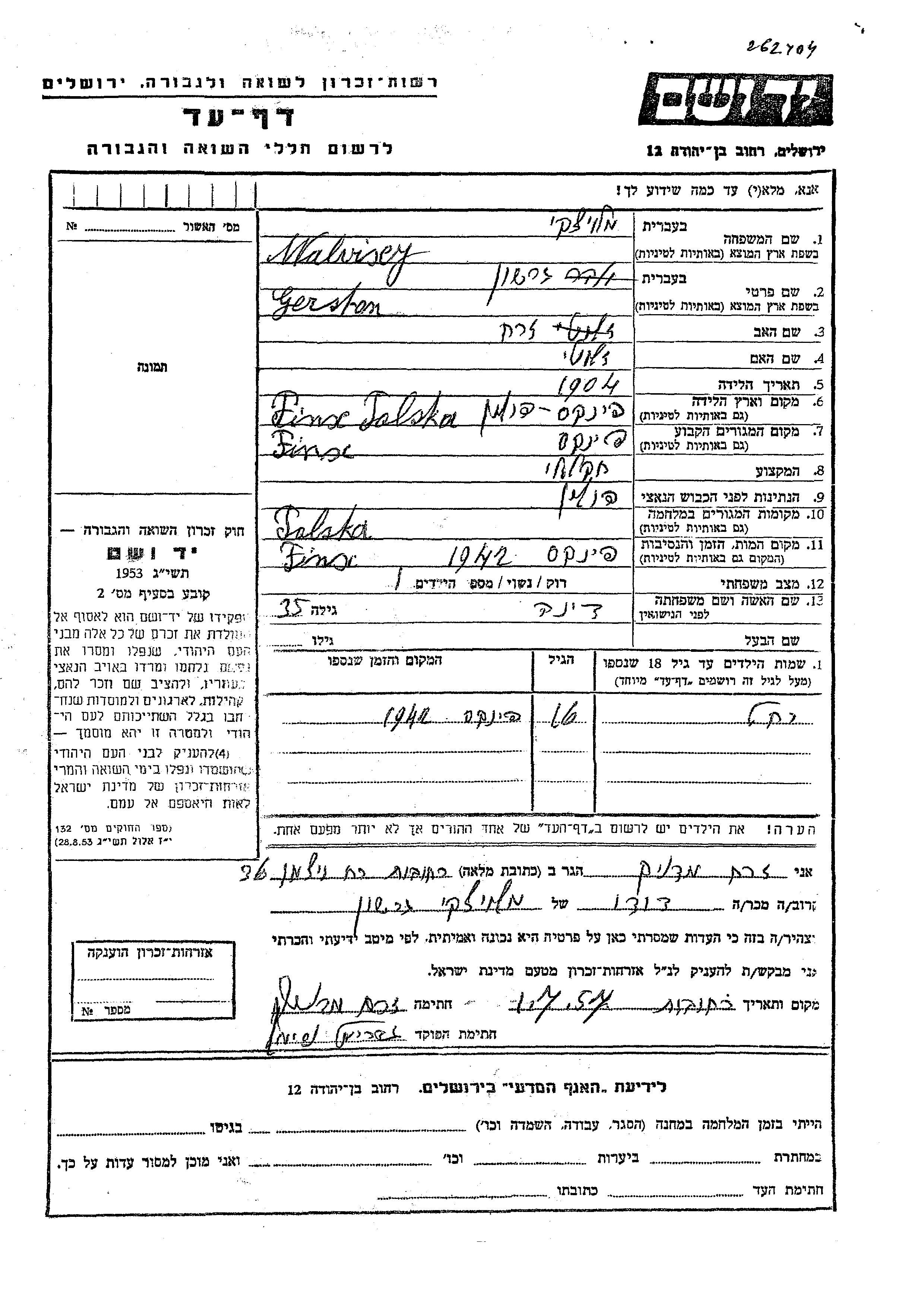 Мальвиски Рахель Пинск, Польша Лист свидетельских показаний