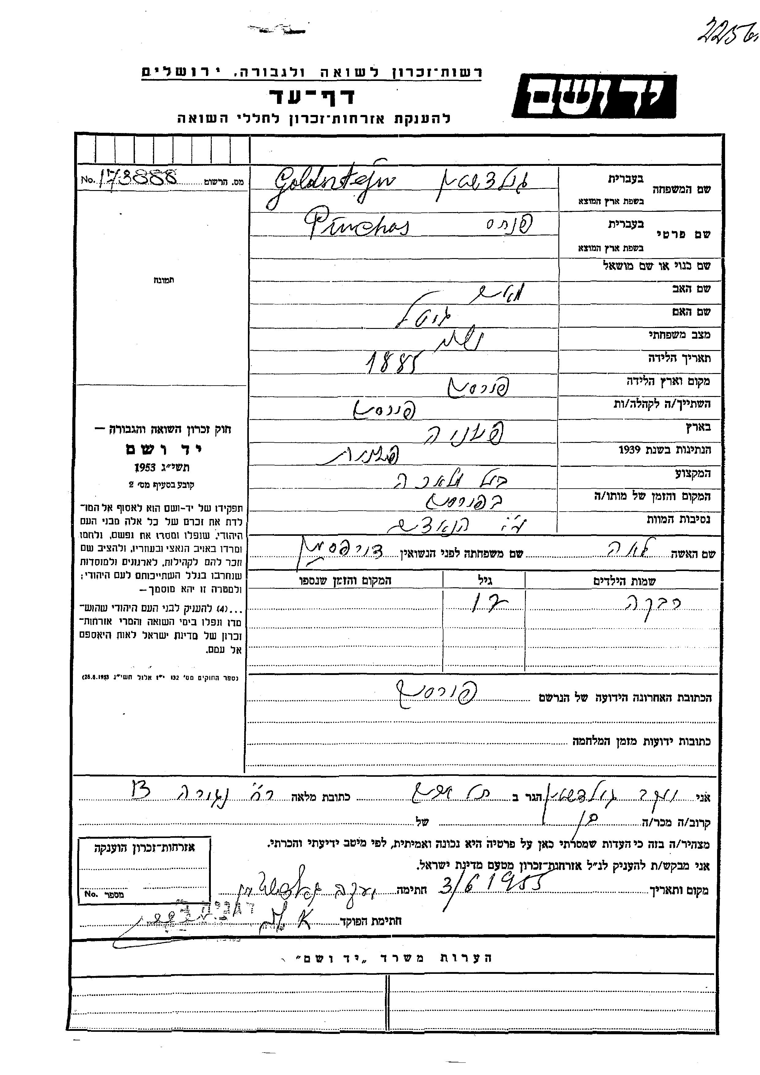 Гольдштейн Пинхас 1885 Porick, Польша Лист свидетельских показаний