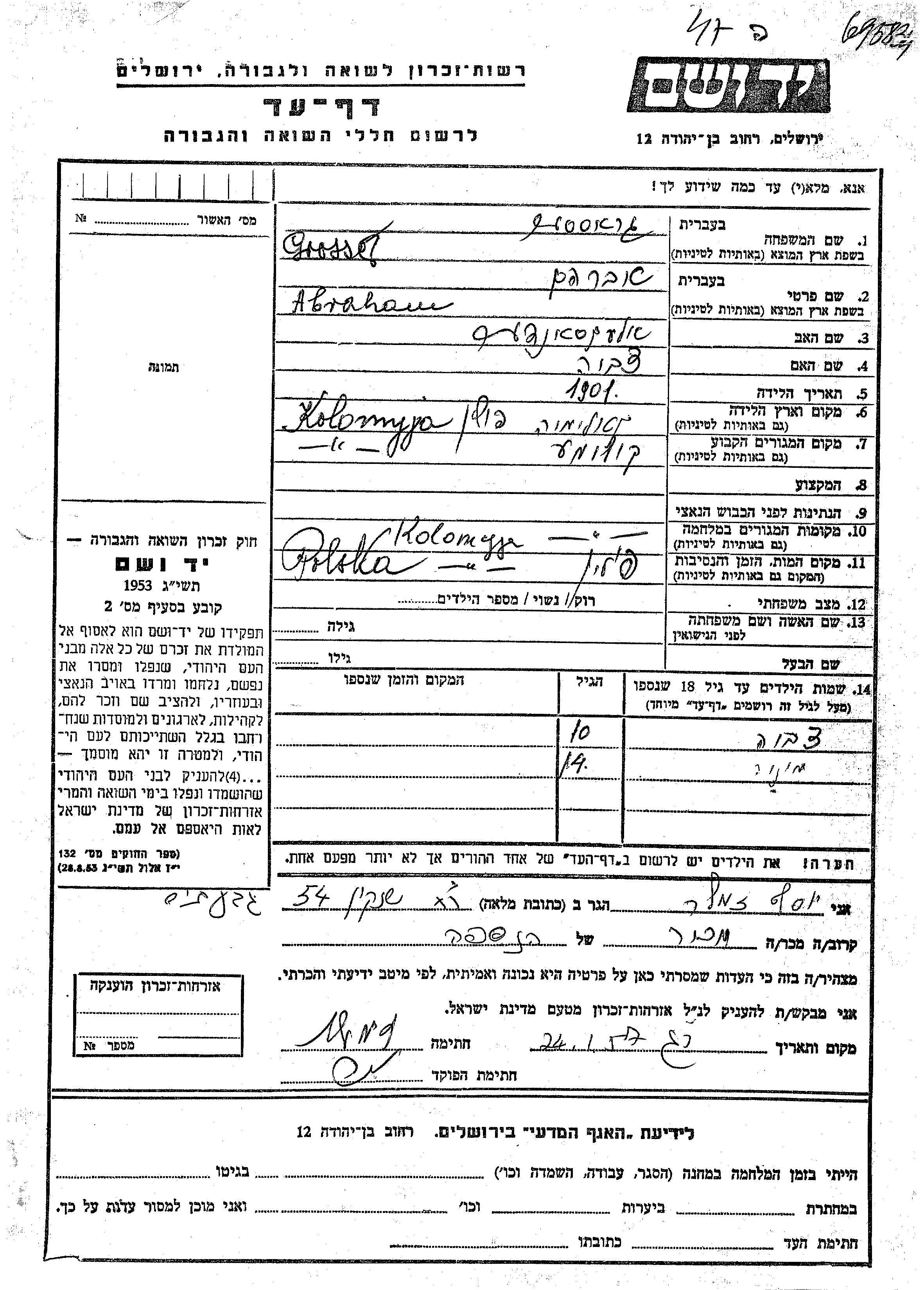 Гроссер Миня Коломыя, Польша Лист свидетельских показаний