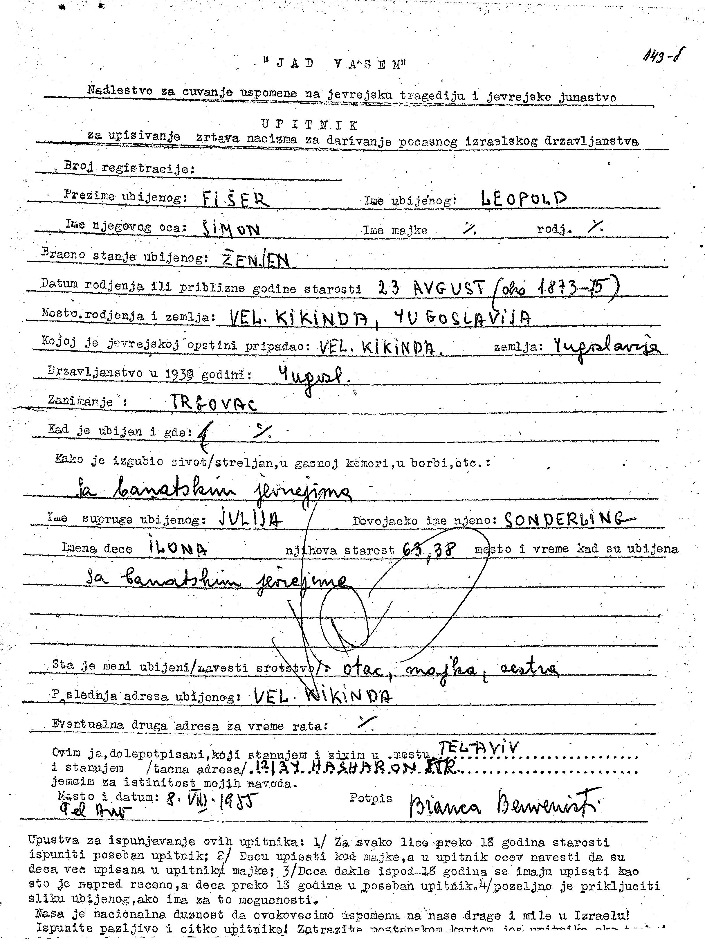 Фисер Илона 1938 Кикинда, Югославия Лист свидетельских показаний