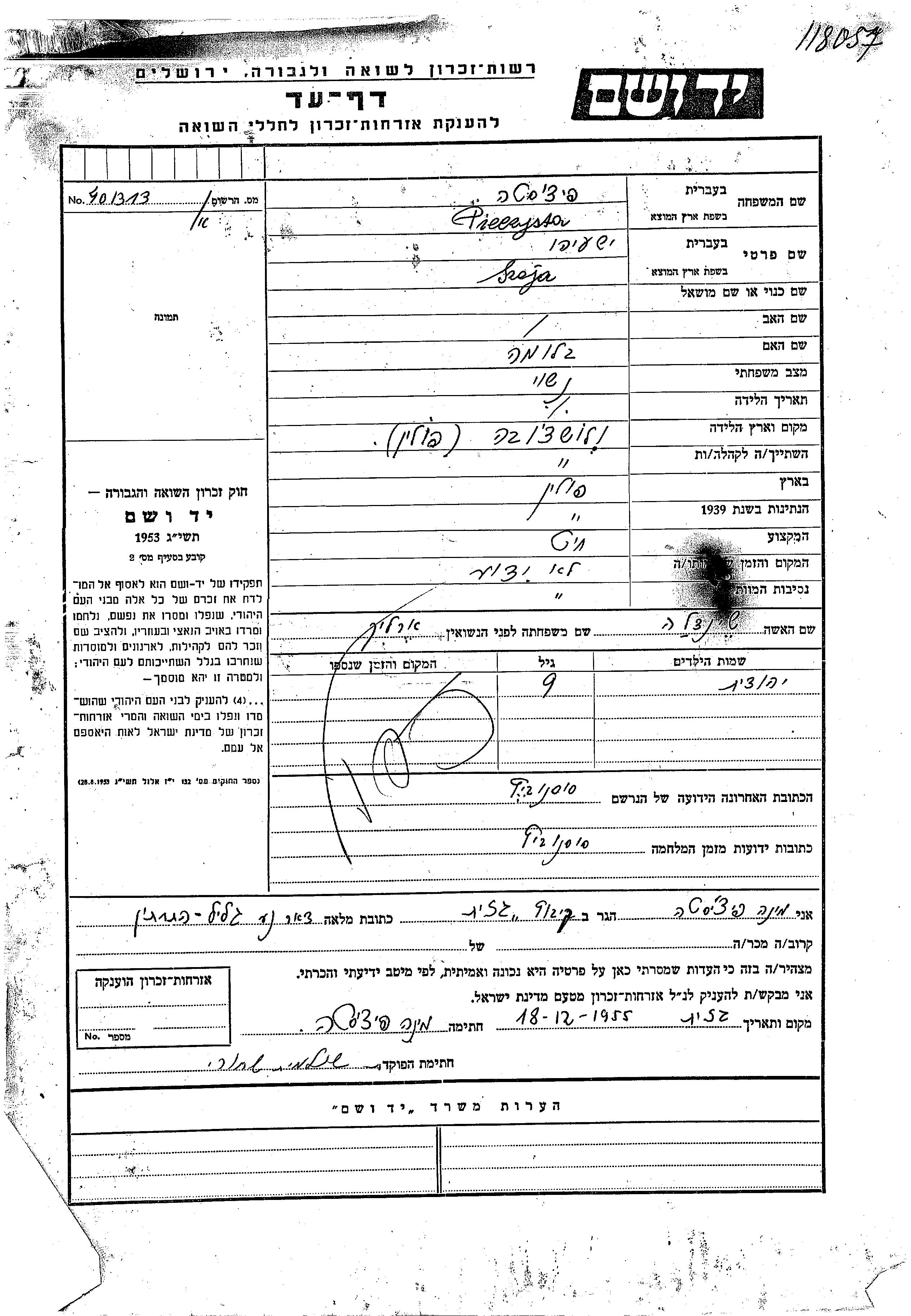 Печиста Иегудит Влоцлавек, Польша Лист свидетельских показаний