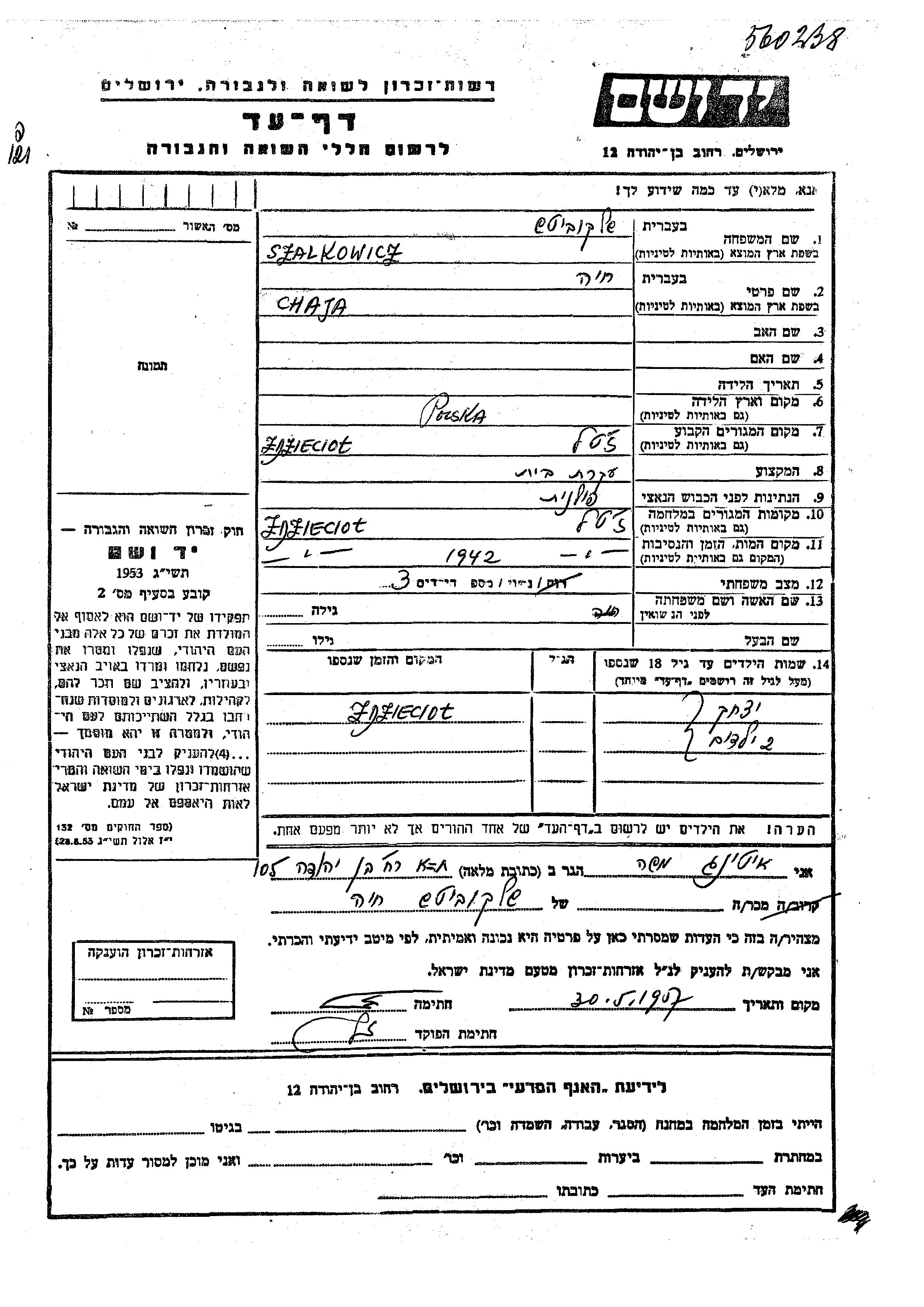 Шалкович Шелкович Ицхак Здзенцёл, Польша Лист свидетельских показаний