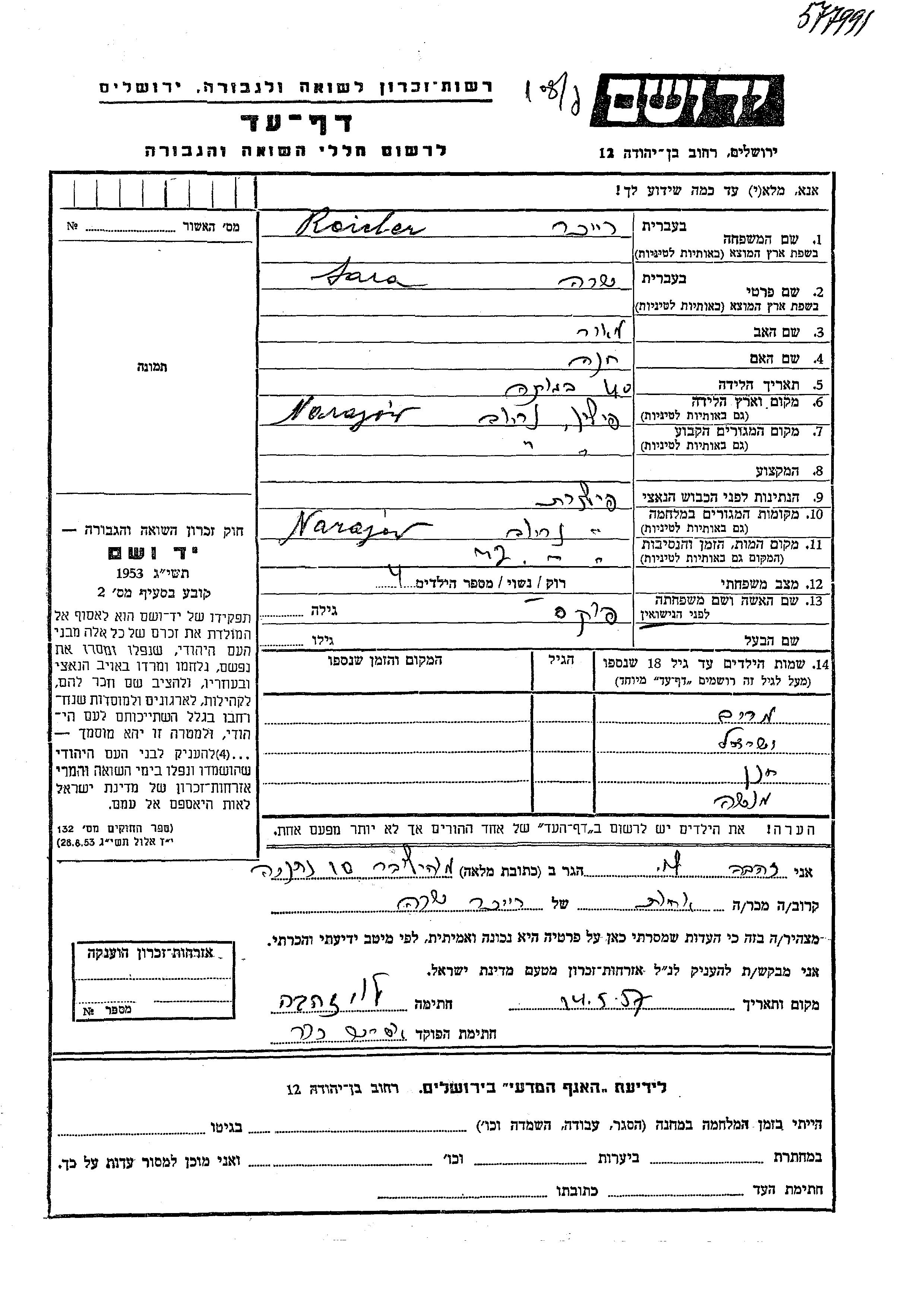 Яд Вашем - Листы свидетельских показаний Мемориального фонда