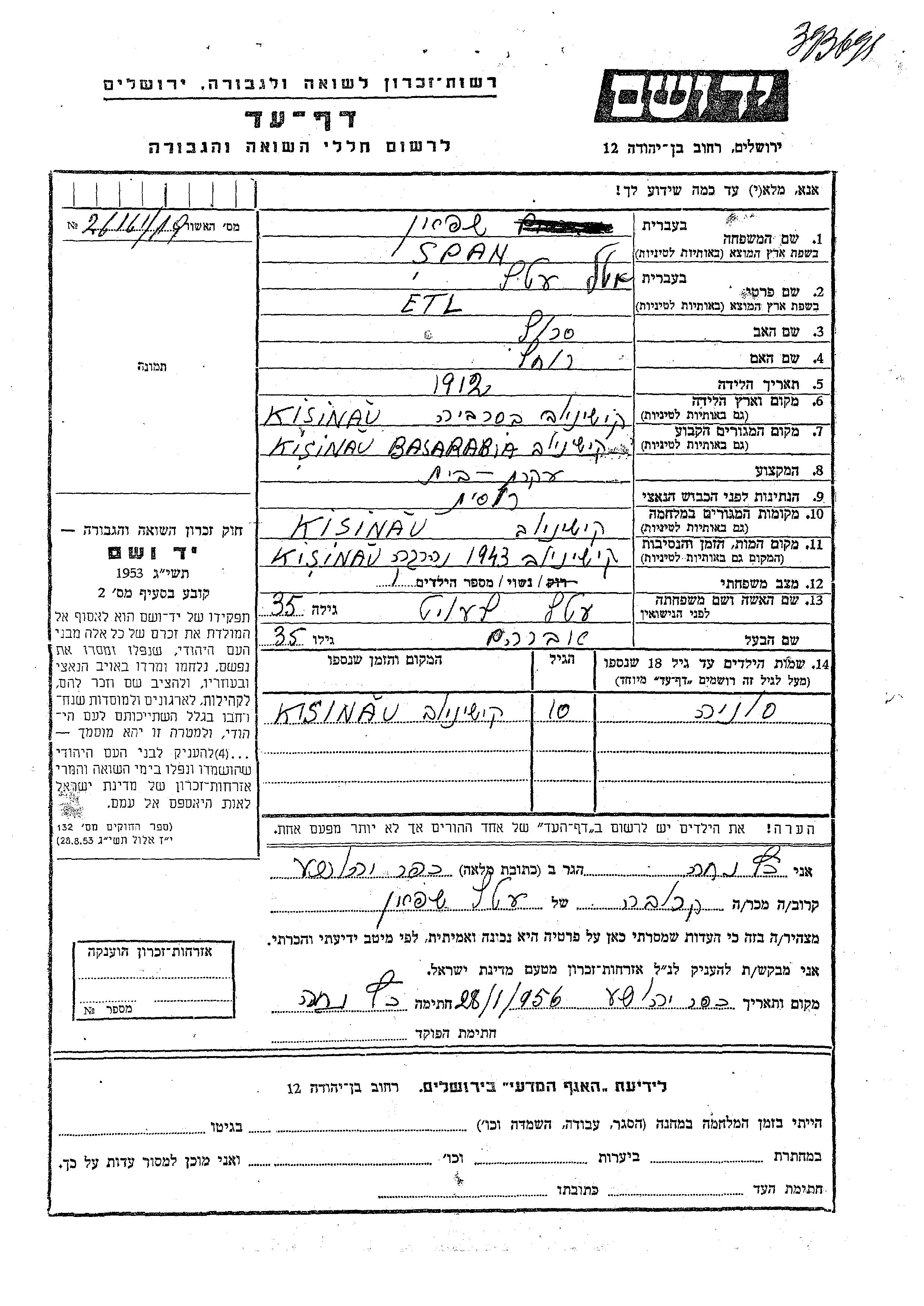 Соня Шпан Авраам Этл девичья фамилия Левит. Ребенок. Место жительства до войны: Кишинёв, Румыния. Место во время войны: Кишинёв, Румыния.