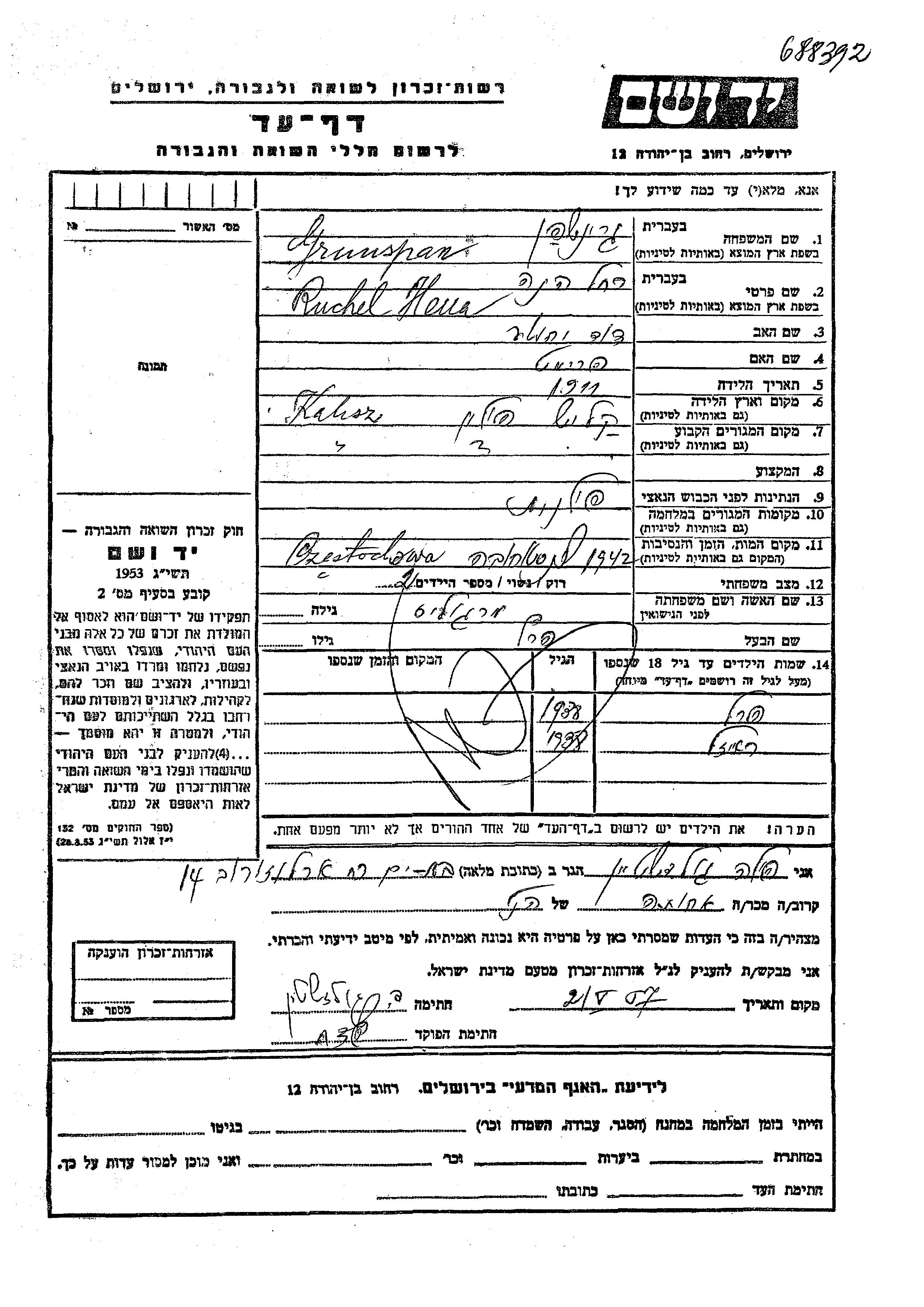 Яд Вашем - Листы свидетельских показаний Мемориального фонда