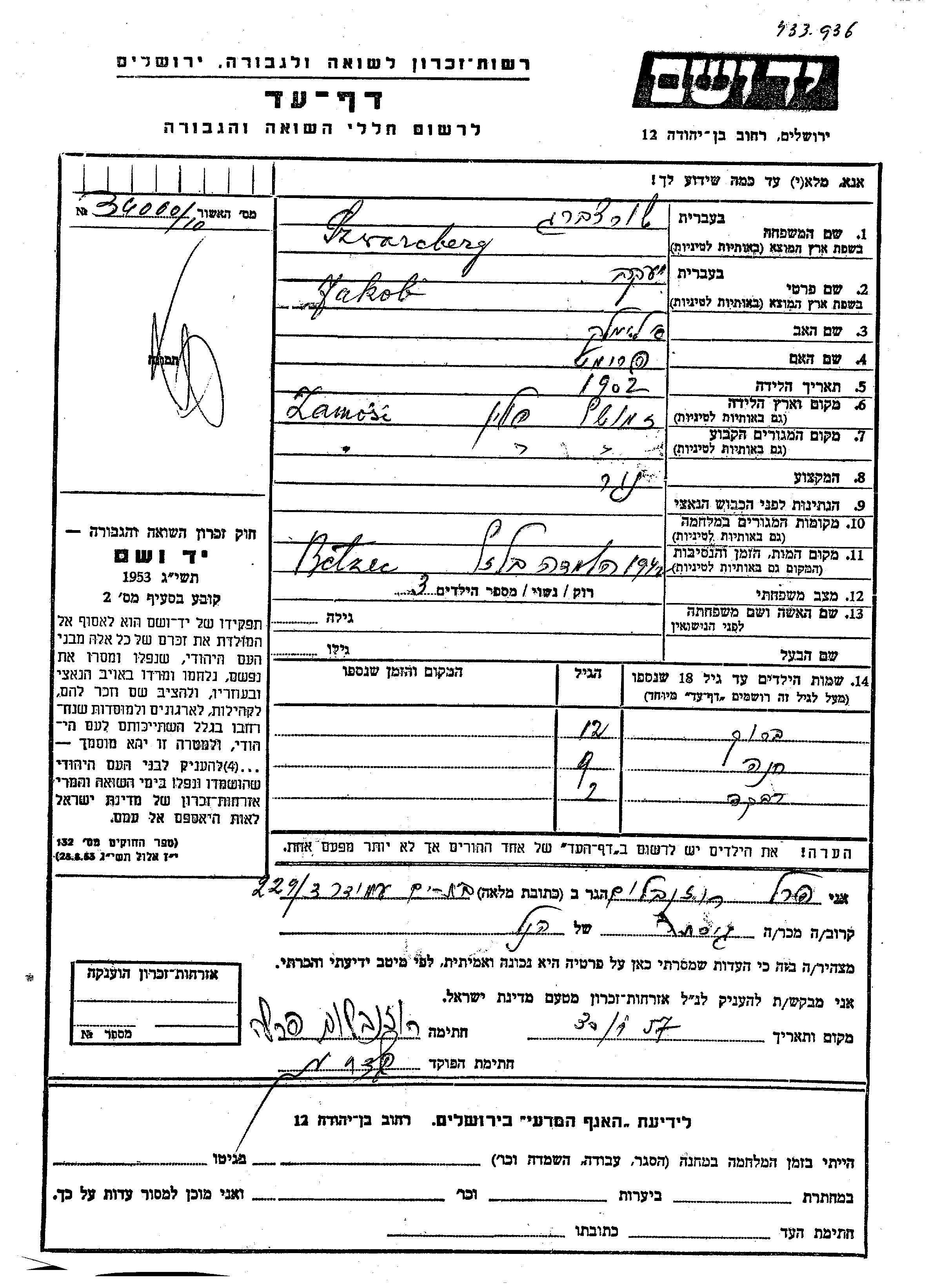Яд Вашем - Листы свидетельских показаний Мемориального фонда