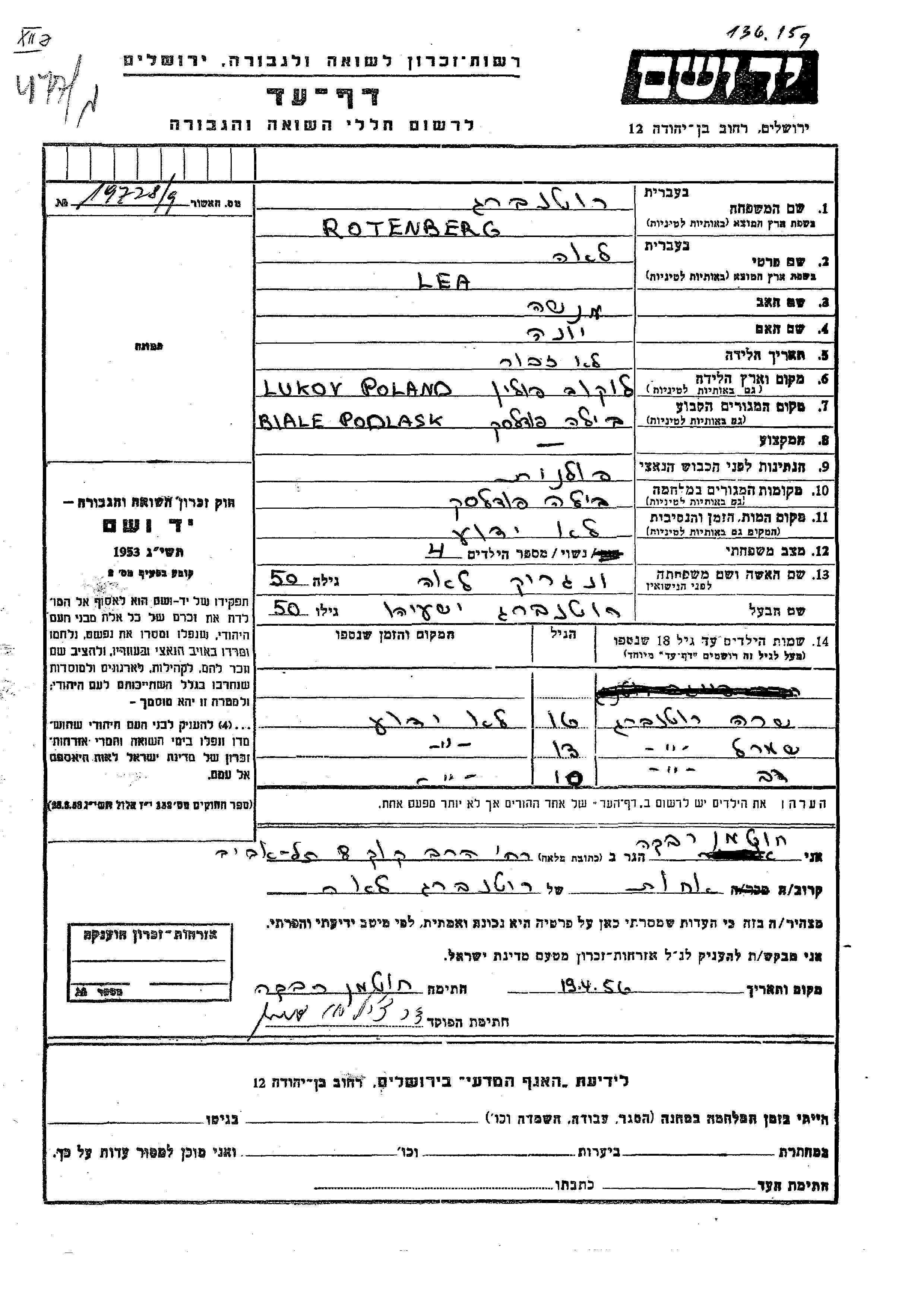 Дов Ротенберг Иешаягу Лея девичья фамилия Венгерик. Ребенок. Место жительства до войны: Бяла-Подляска, Польша. Место во время войны: Бяла-Подляска, Польша.