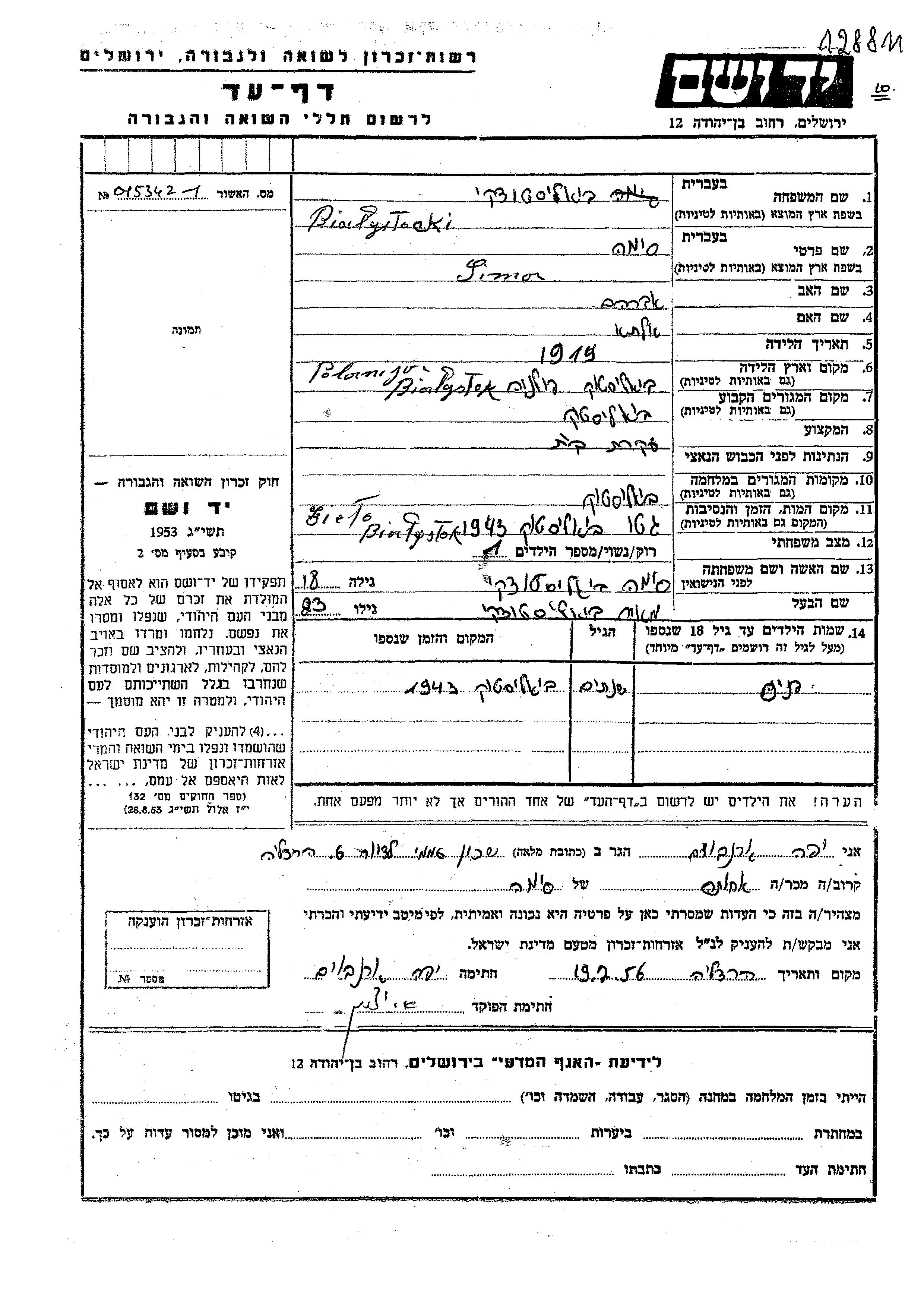 Бялыстоцки Пнина Белосток, Польша Лист свидетельских показаний