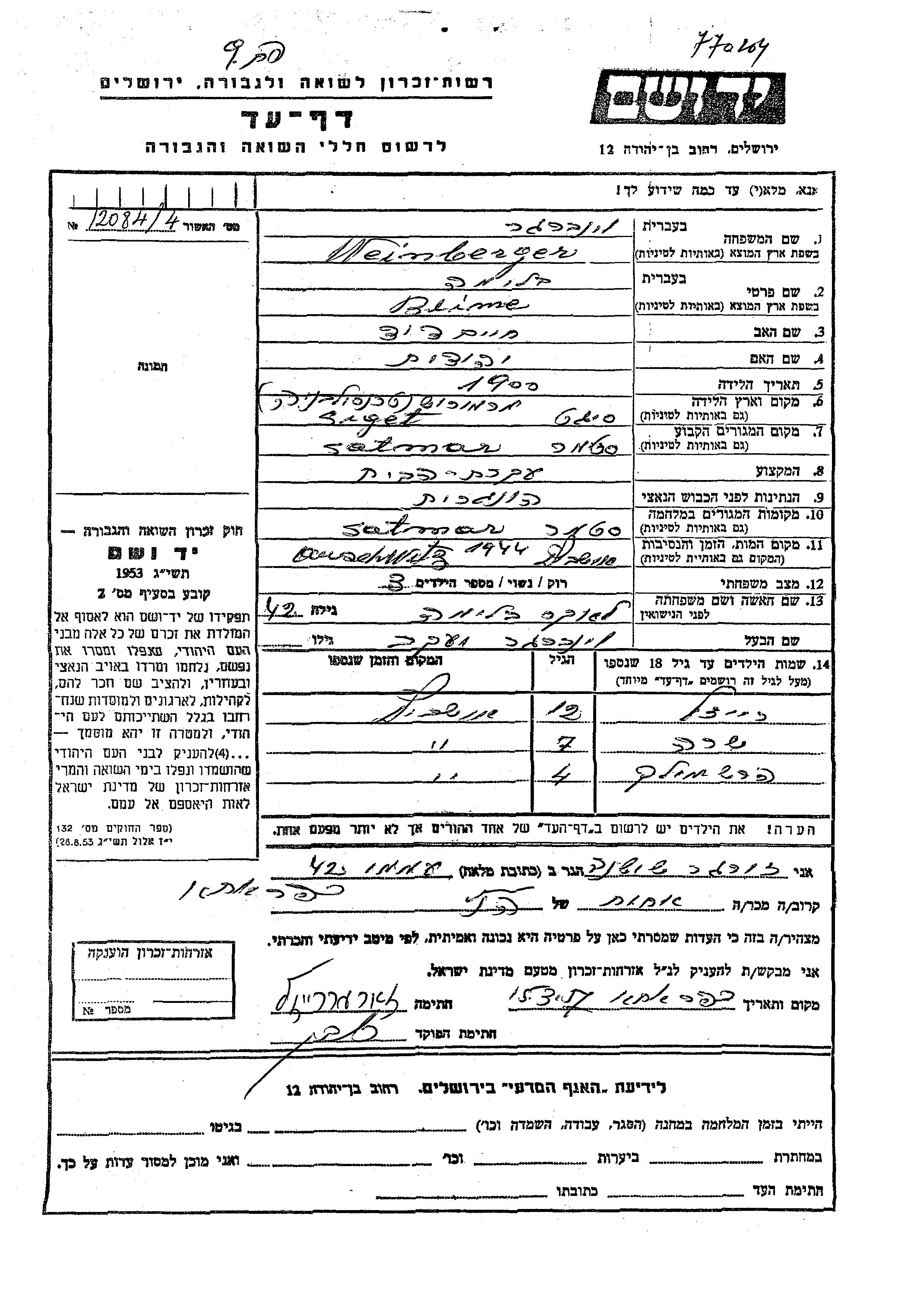 Герш Милек Вейнбергер Яков Блиме девичья фамилия Лакс. Ребенок. Место жительства до войны: Шатмар, Румыния. Место во время войны: Шатмар, Румыния.