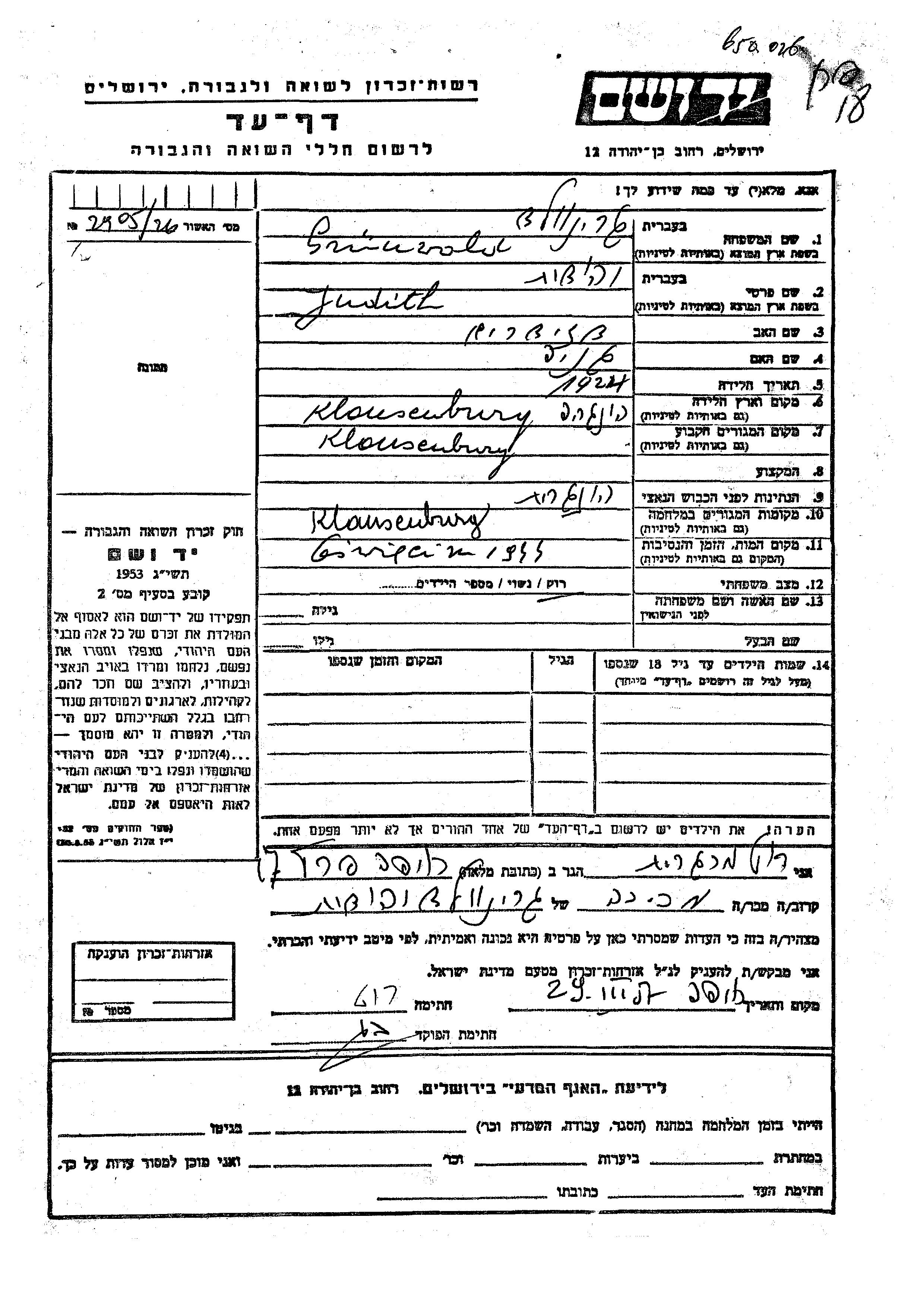 Гринвальд Юдит 1924 Клаузенберг, Румыния Лист свидетельских показаний