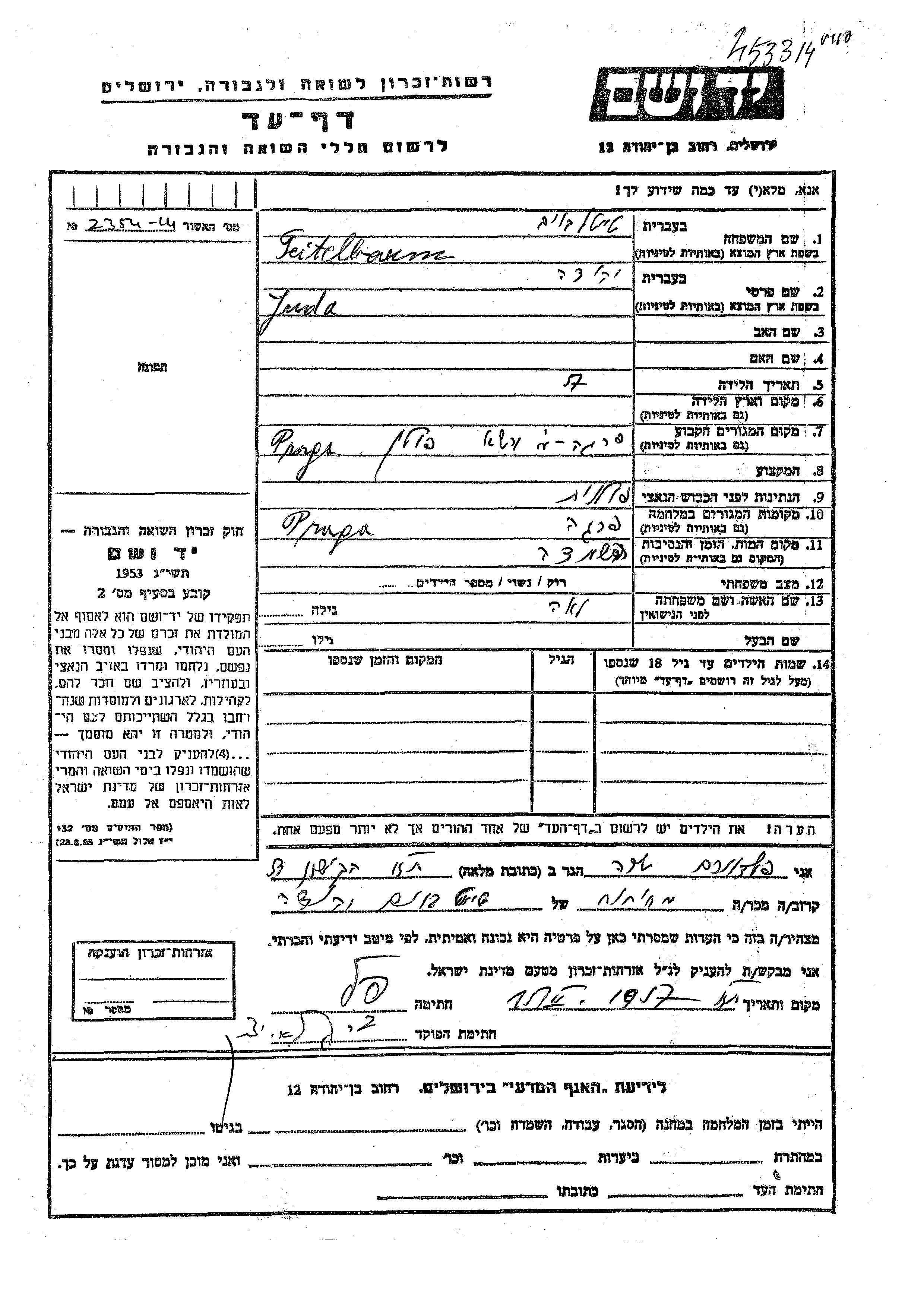 Юда Тейтельбойм. Женат / замужем. Место жительства до войны: Прага, Польша. Место во время войны: Прага, Польша.