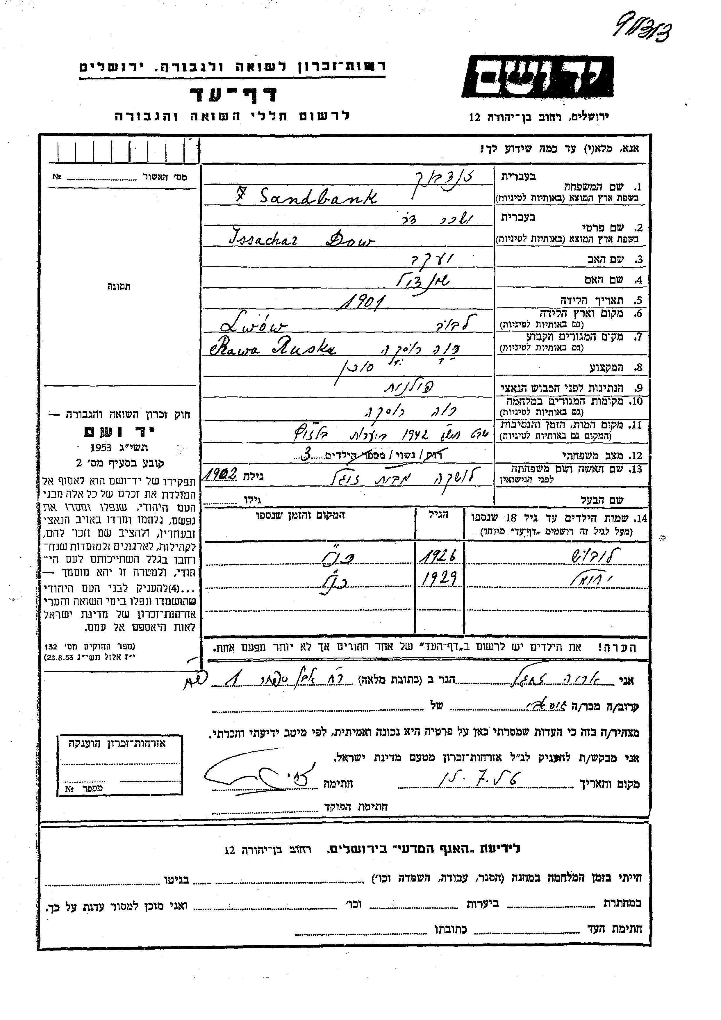 Лейбуш Сандбанк родился/родилась. Отец: Иссахар Дов, mать:Лошка, девичья фамилия Зигель. Ребенок. Место жительства до войны: Рава-Русская, Польша. Место во время войны: Рава-Русская, Польша.