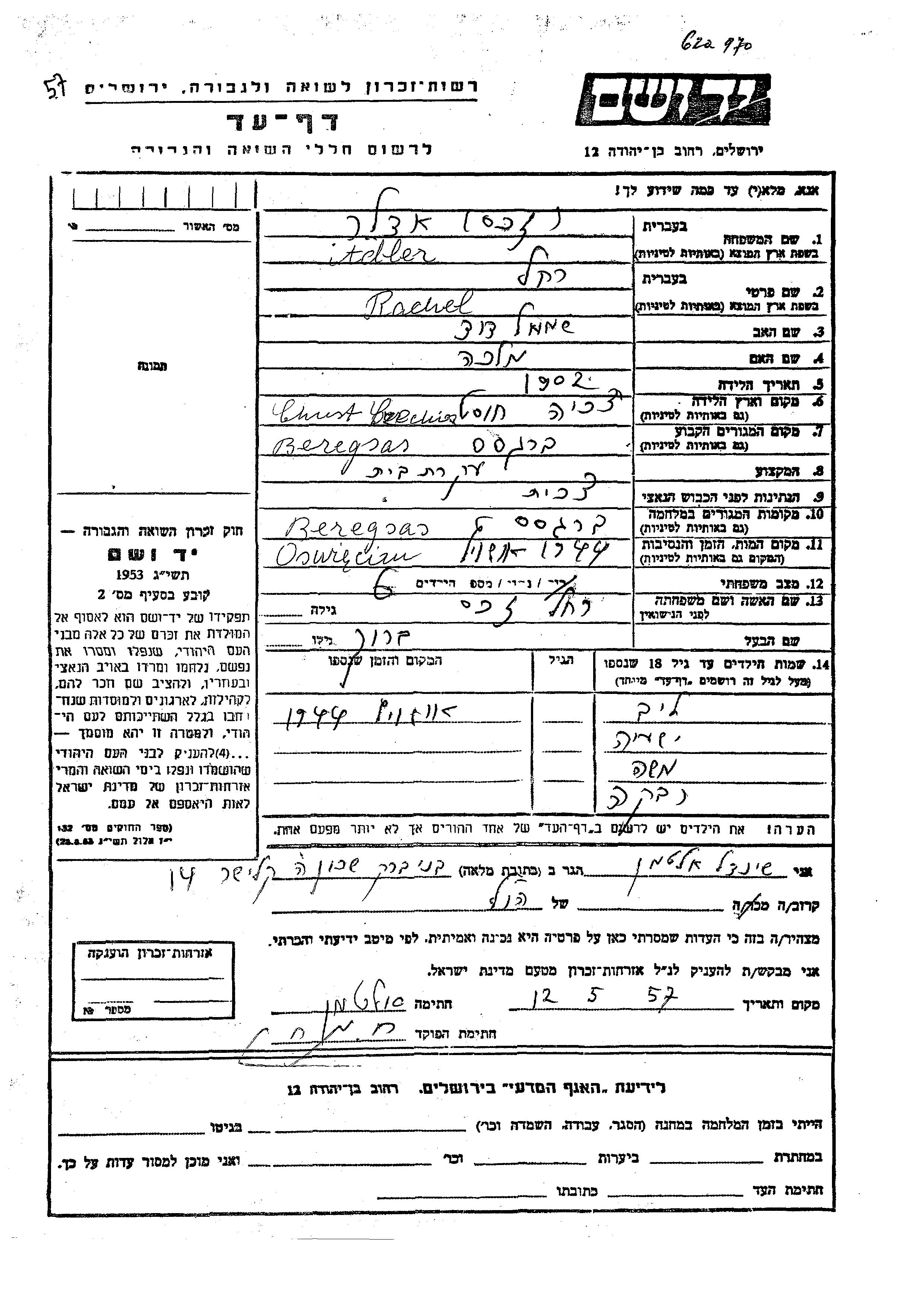 Адлер Ривка Берегсас, Чехословакия Лист свидетельских показаний