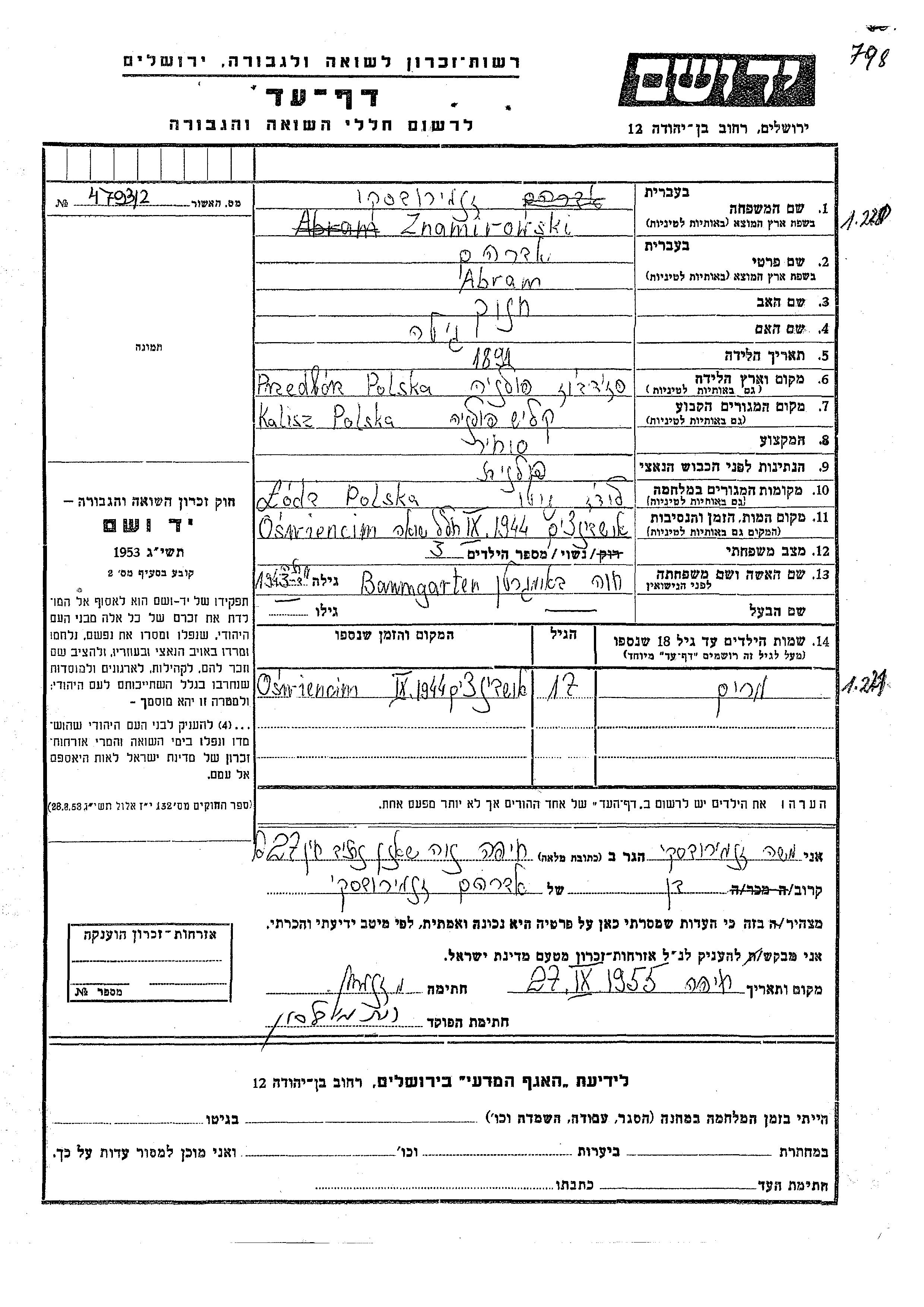 Знамировски Мирьям Калиш, Польша Лист свидетельских показаний