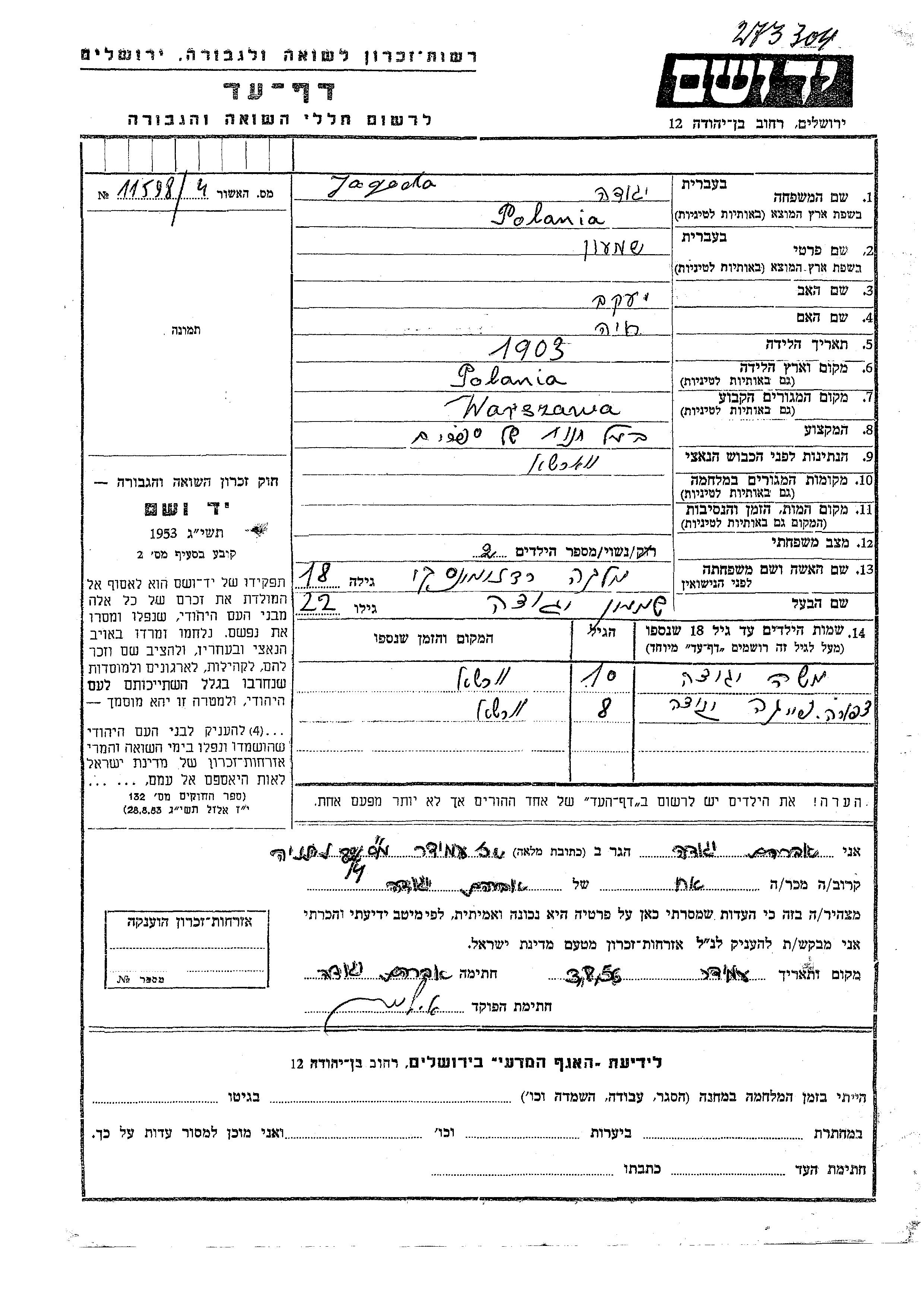 Ягода Моше Варшава, Польша Лист свидетельских показаний
