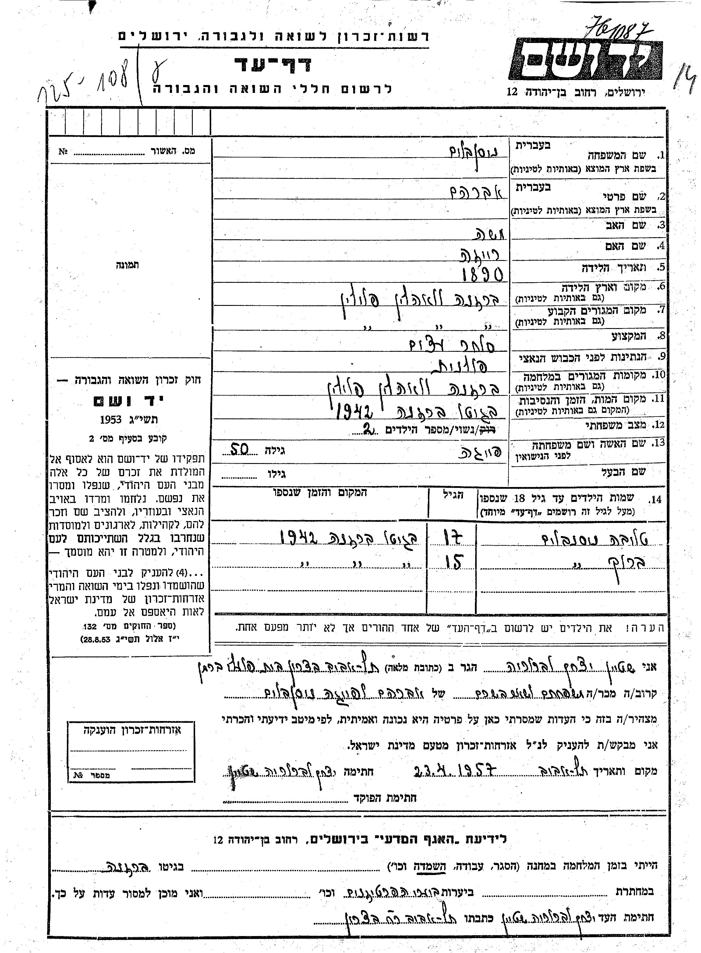 Яд Вашем - Листы свидетельских показаний Мемориального фонда