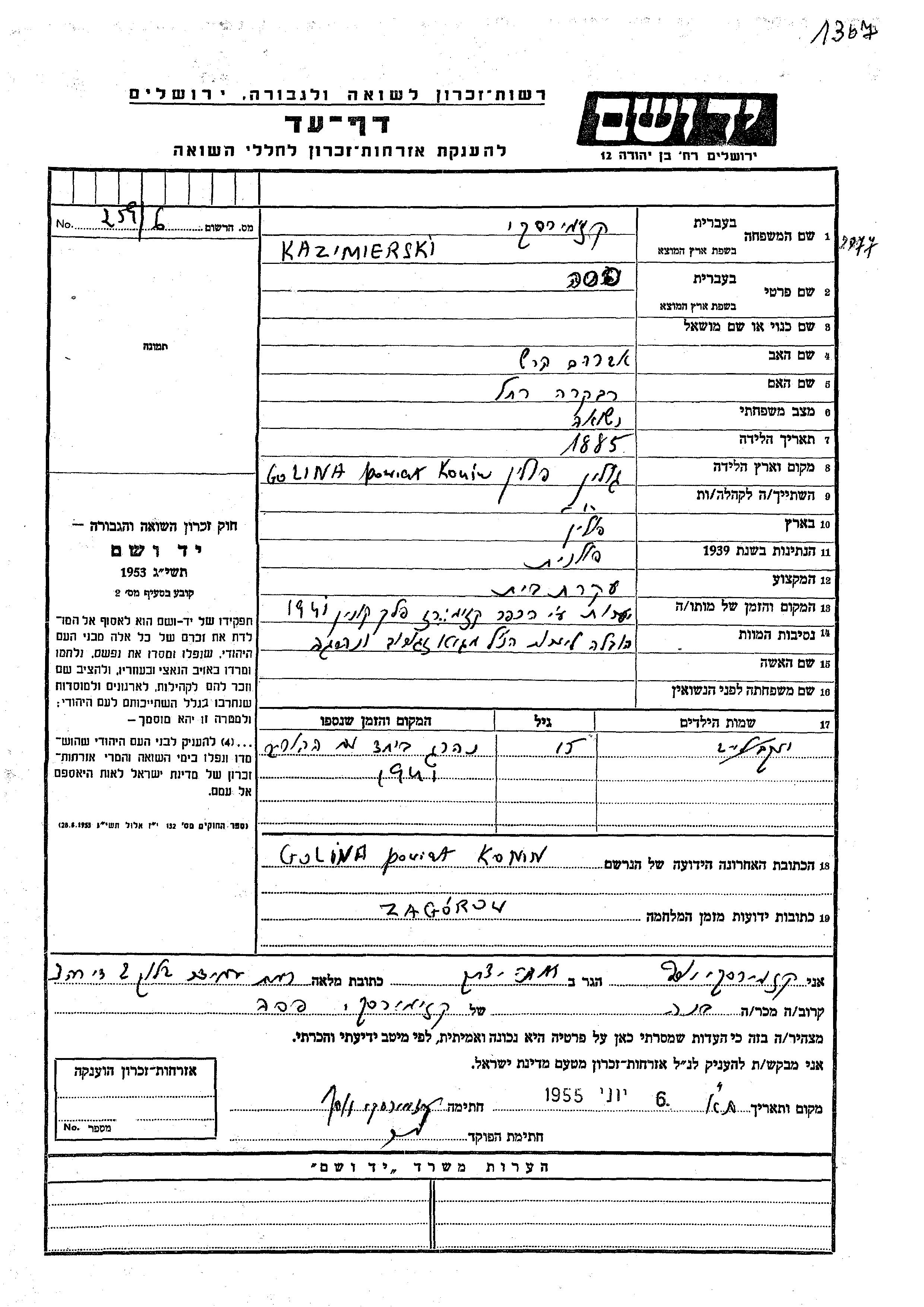 Казимерски Яков Лейб Голина, Польша Лист свидетельских показаний