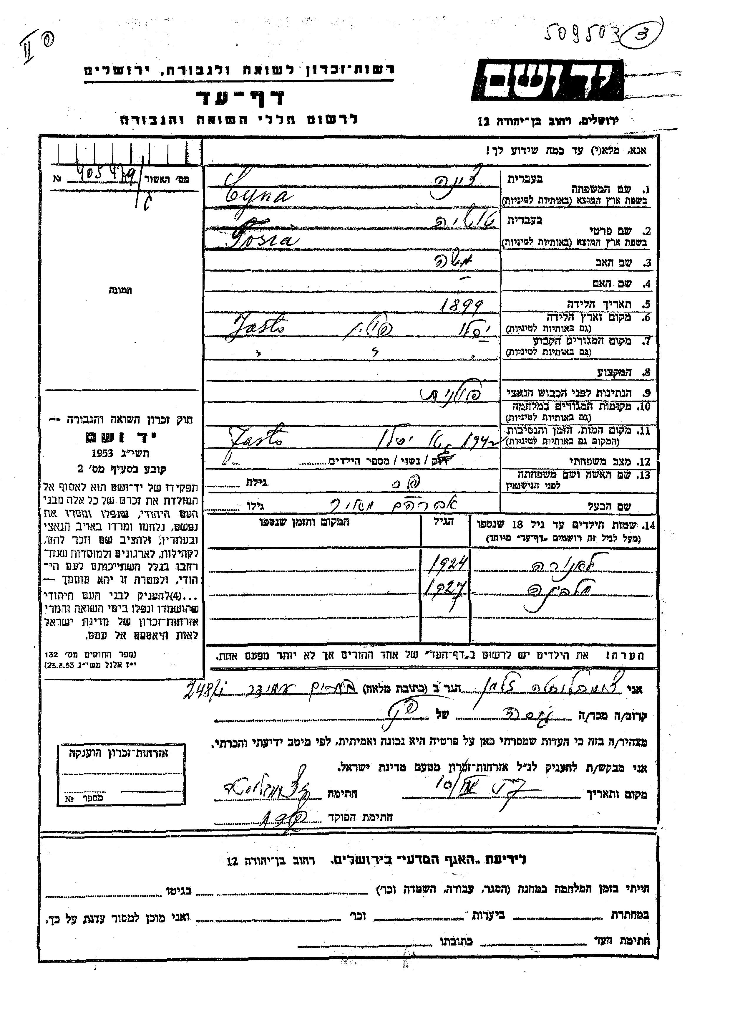 Цина Мальвина 1927 Ясло, Польша Лист свидетельских показаний