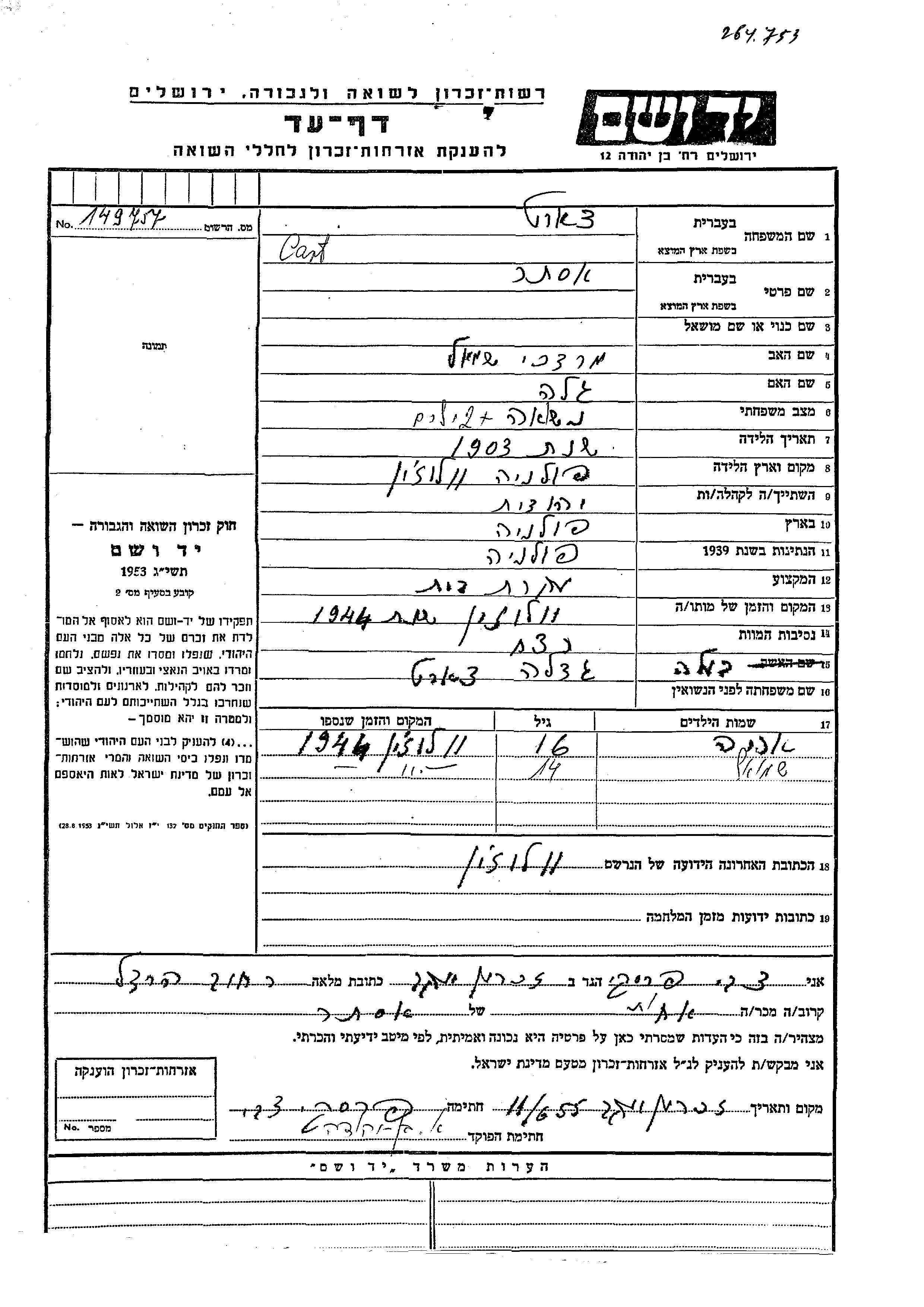 Яд Вашем - Листы свидетельских показаний Мемориального фонда