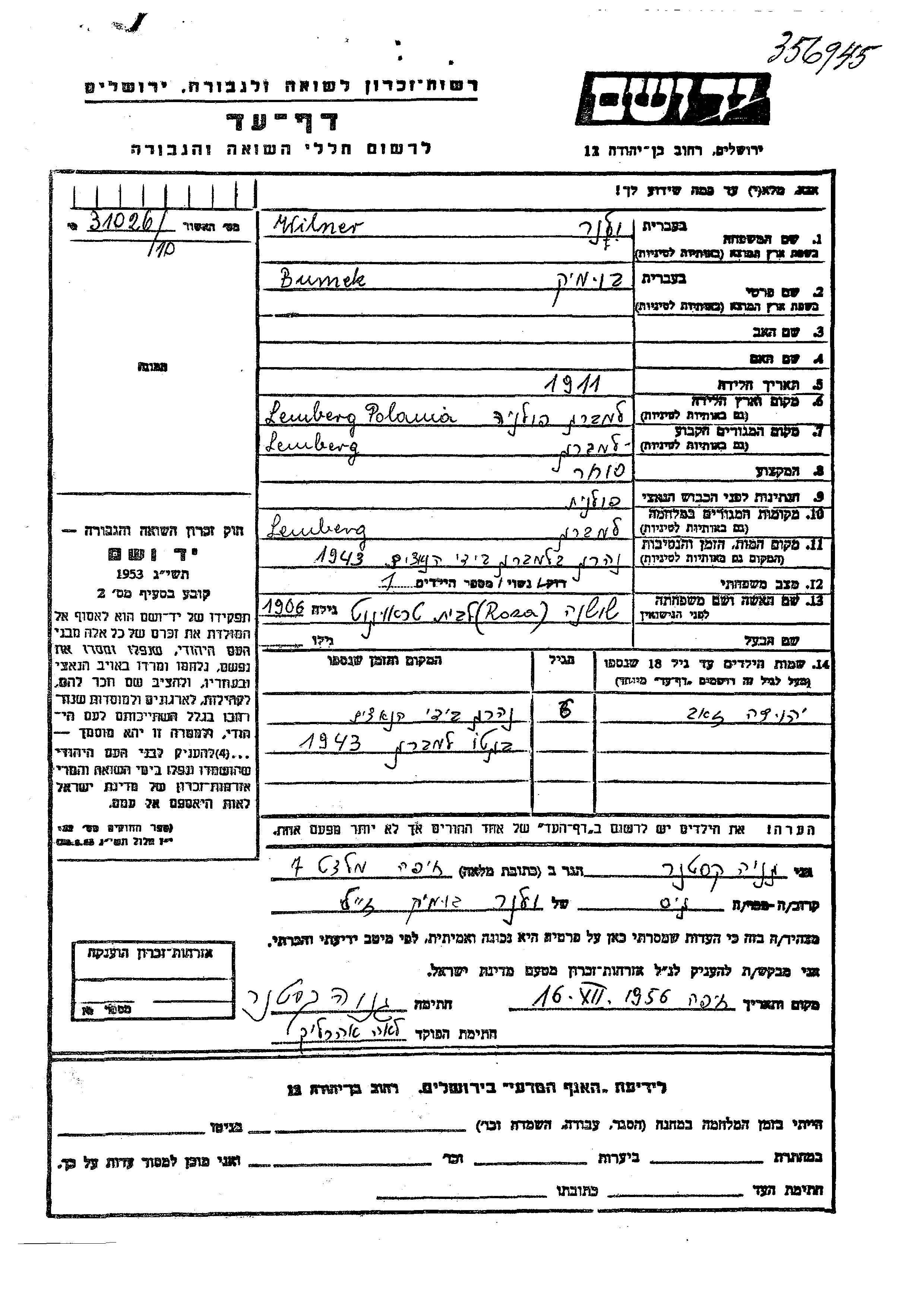 Иегуда Зеев Вильнер Вальнер Бумек Роза Шошана девичья фамилия Траугот. Ребенок. Место жительства до войны: Лемберг, Польша. Место во время войны: Лемберг, Польша.