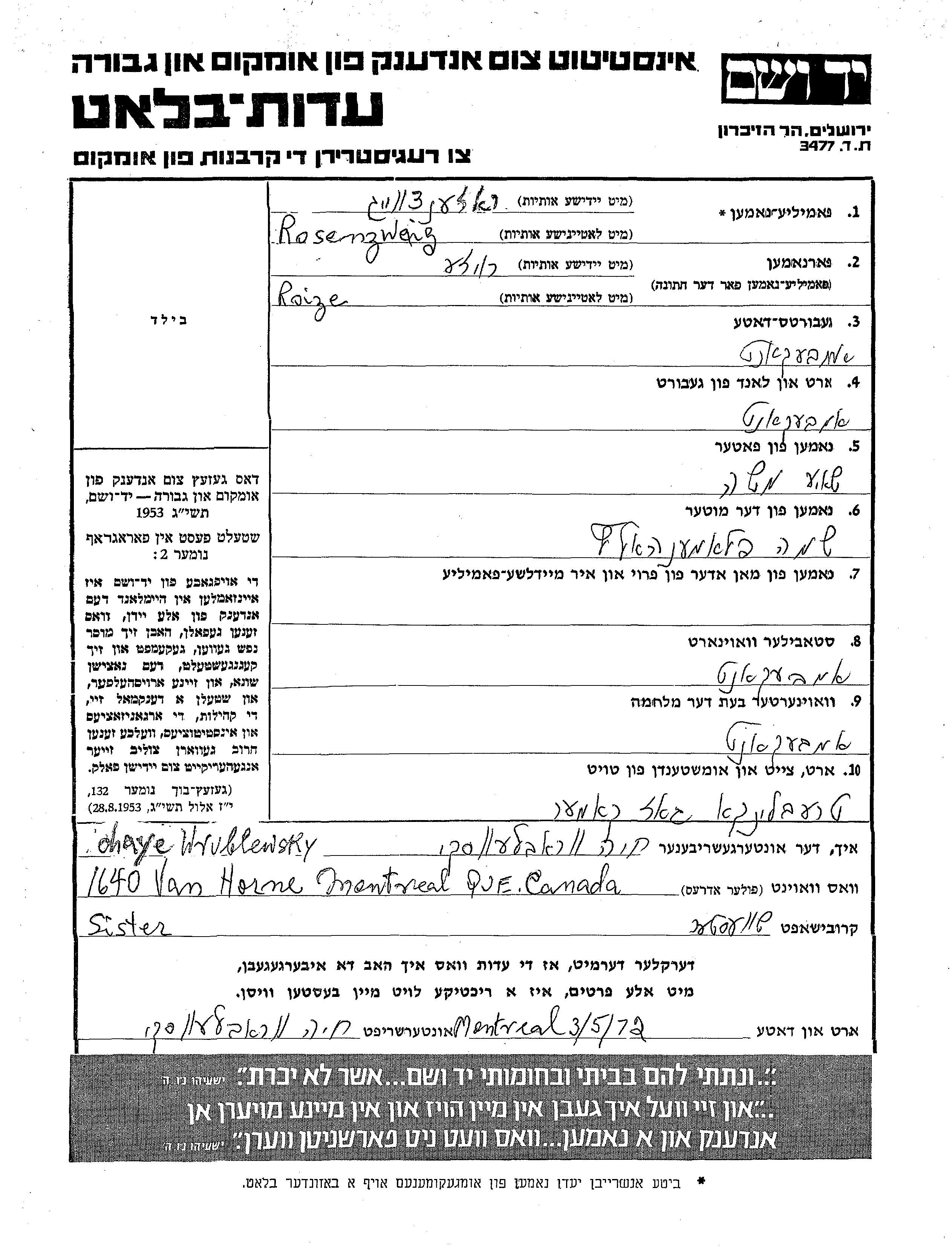 Розенцвайг Ройзе место не указано, Лист свидетельских показаний