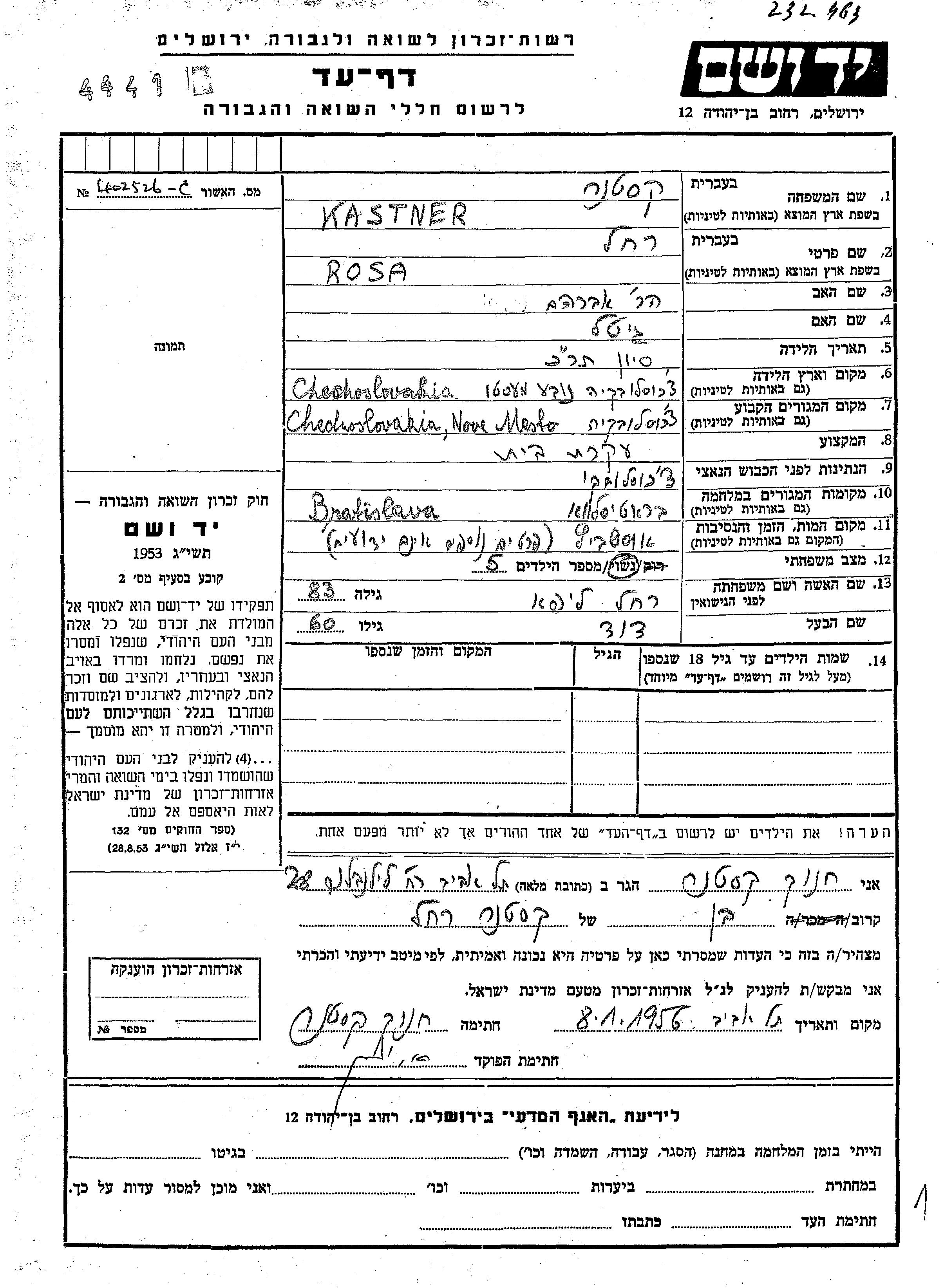 Кастнер Роза Рахель 1860 Нове-Место, Чехословакия Лист свидетельских показаний