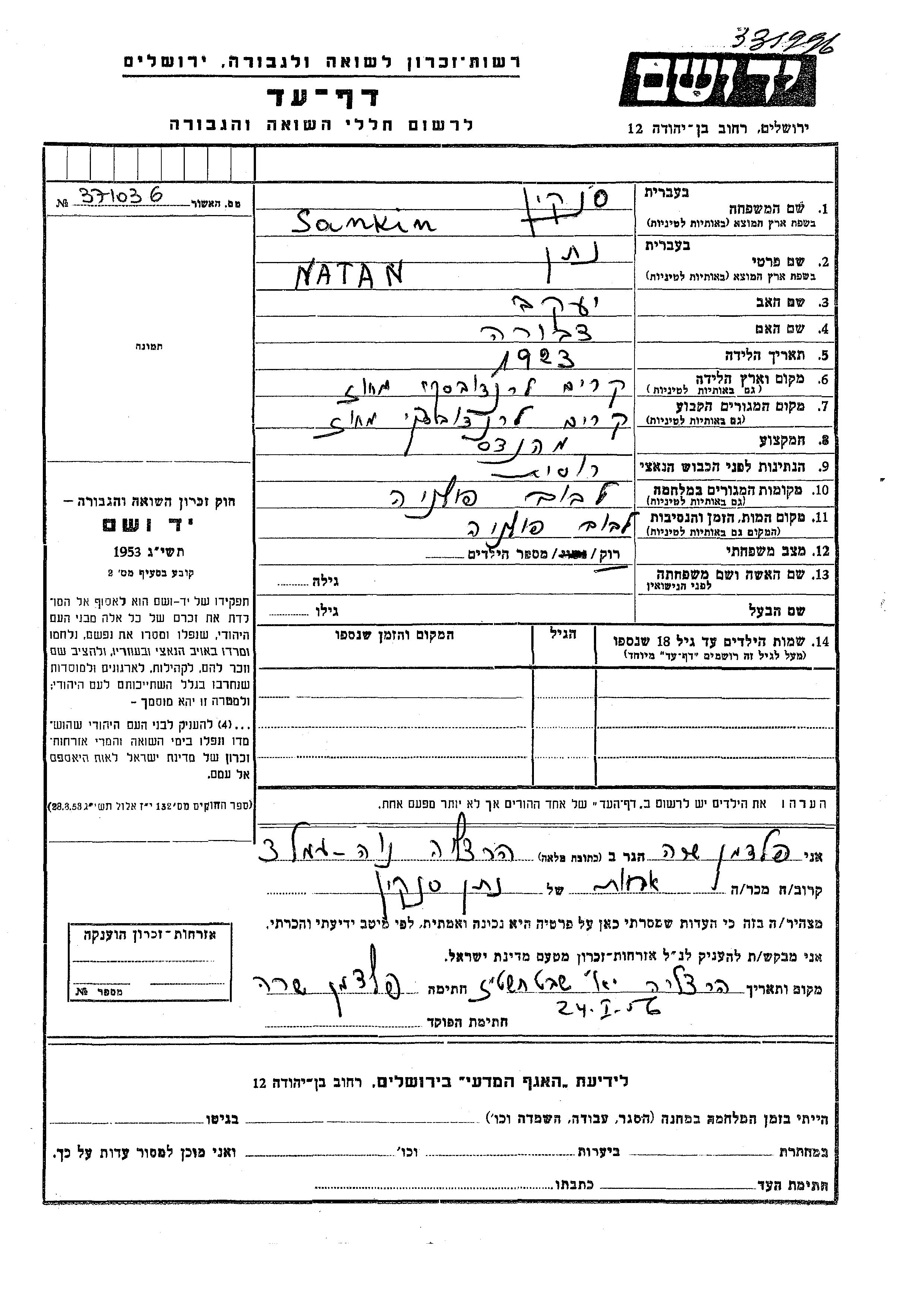 Натан Санкин, место рождения: Крымская АССР, Россия (СССР). Отец: Яков, mать:Двора. Инженер. Холост / не замужем. Место жительства до войны: Крымская АССР, Россия (СССР). Место во время войны: Львов, Польша.