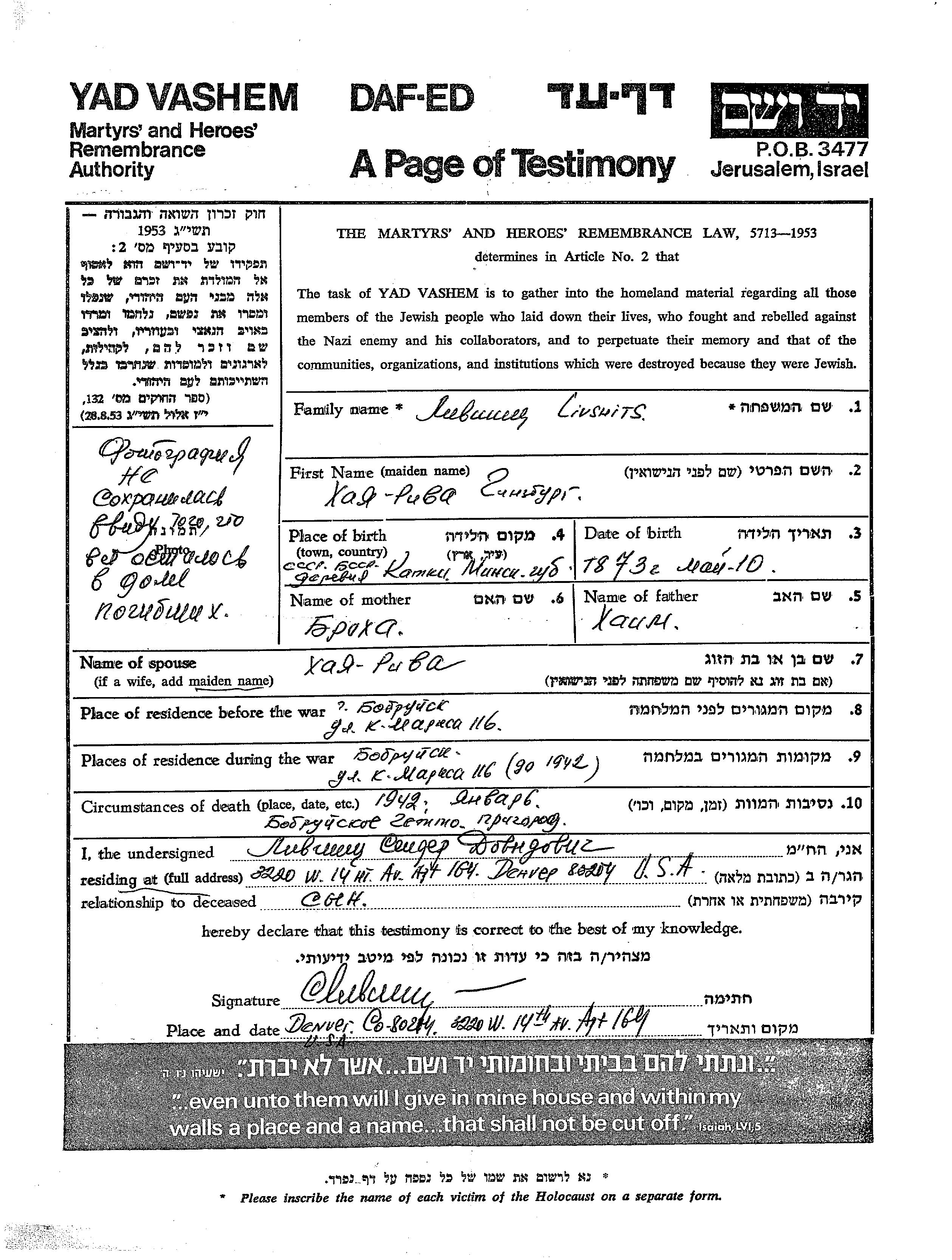 Лившиц Хая Рива 1873 Бобруйск, Белоруссия (СССР) Лист свидетельских показаний