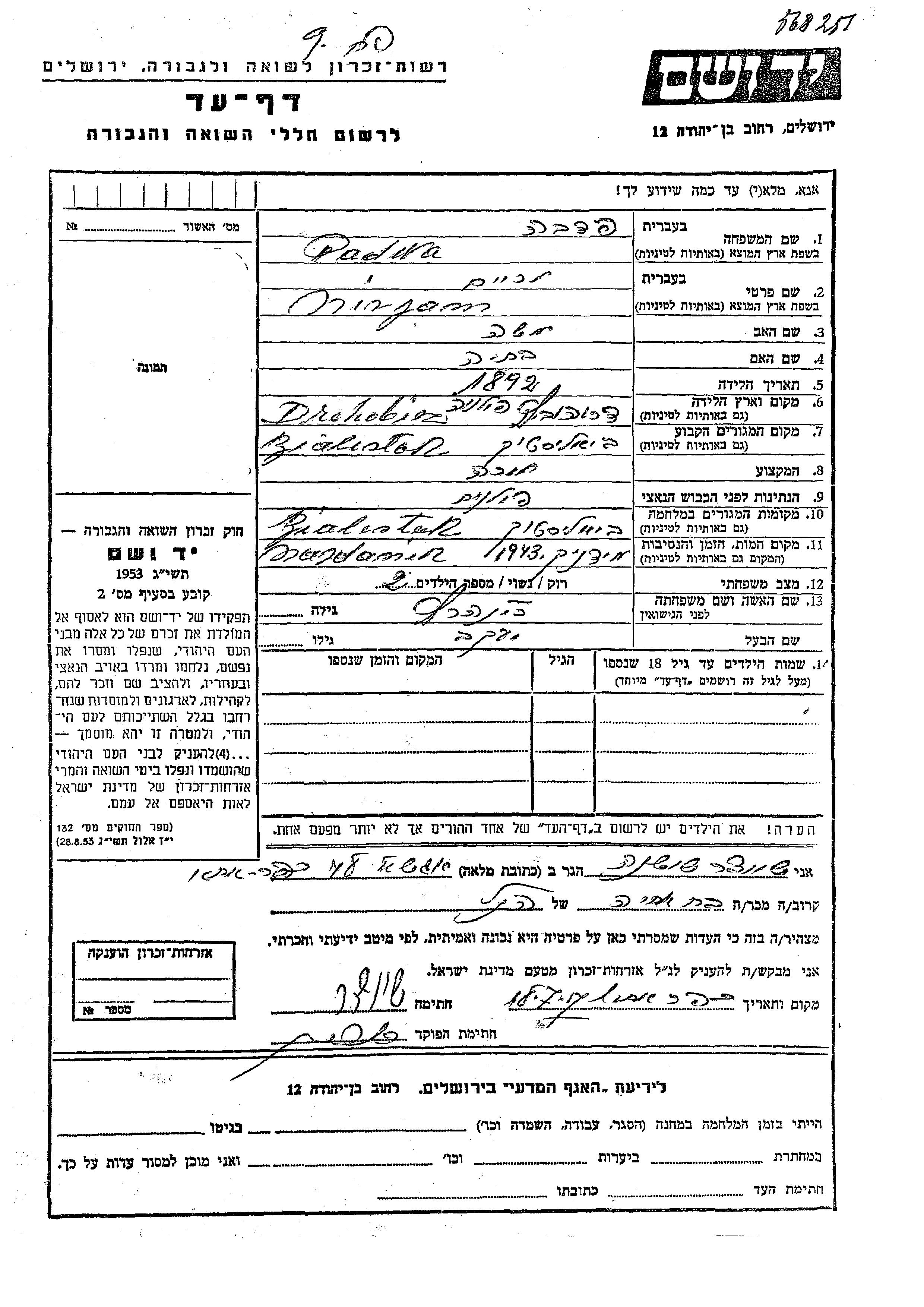 Падва Мирьям 1892 Белосток, Польша Лист свидетельских показаний
