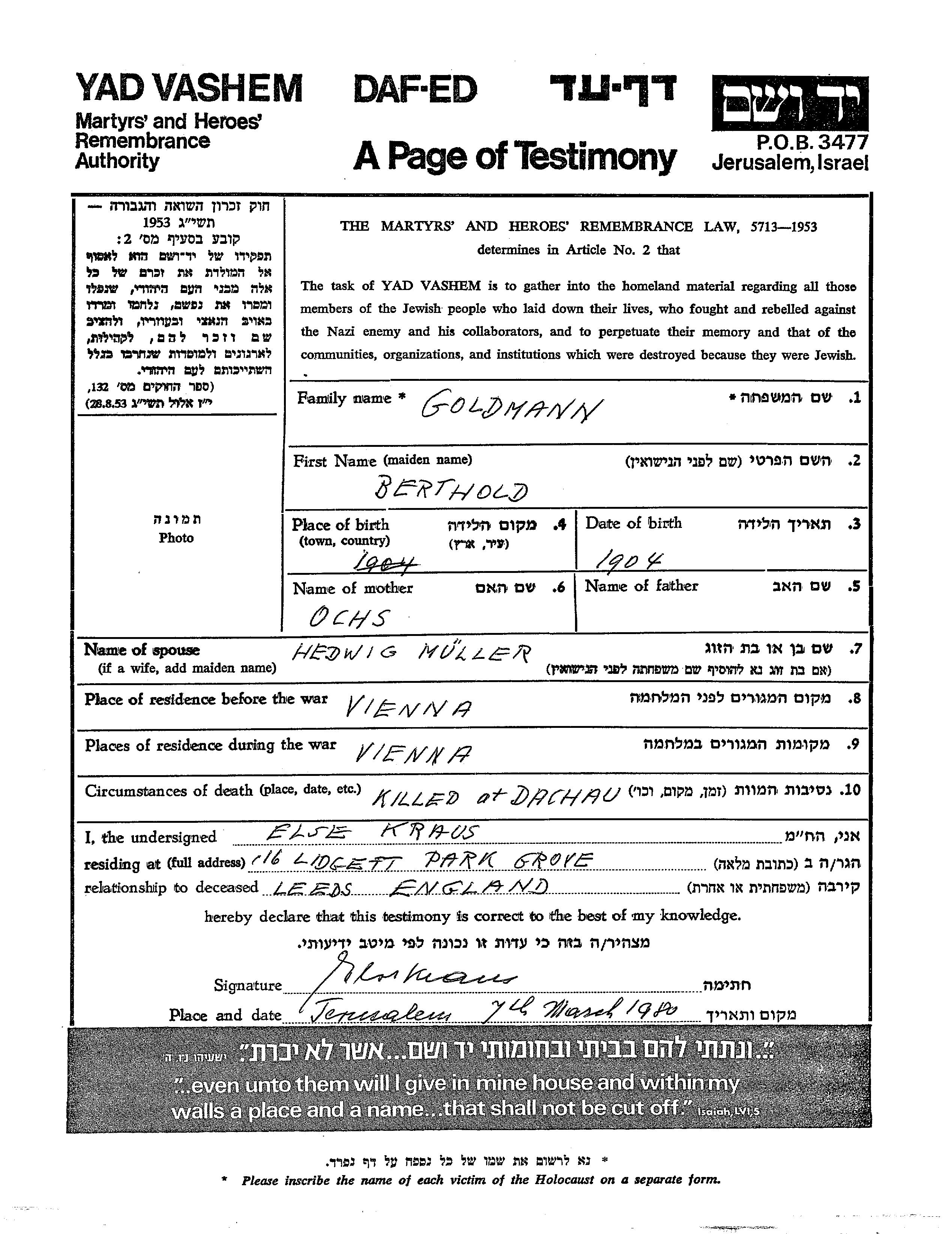 Бертольд Гольдманн. Женат / замужем. Место жительства до войны: Вена, Австрия. Место во время войны: Вена, Австрия.