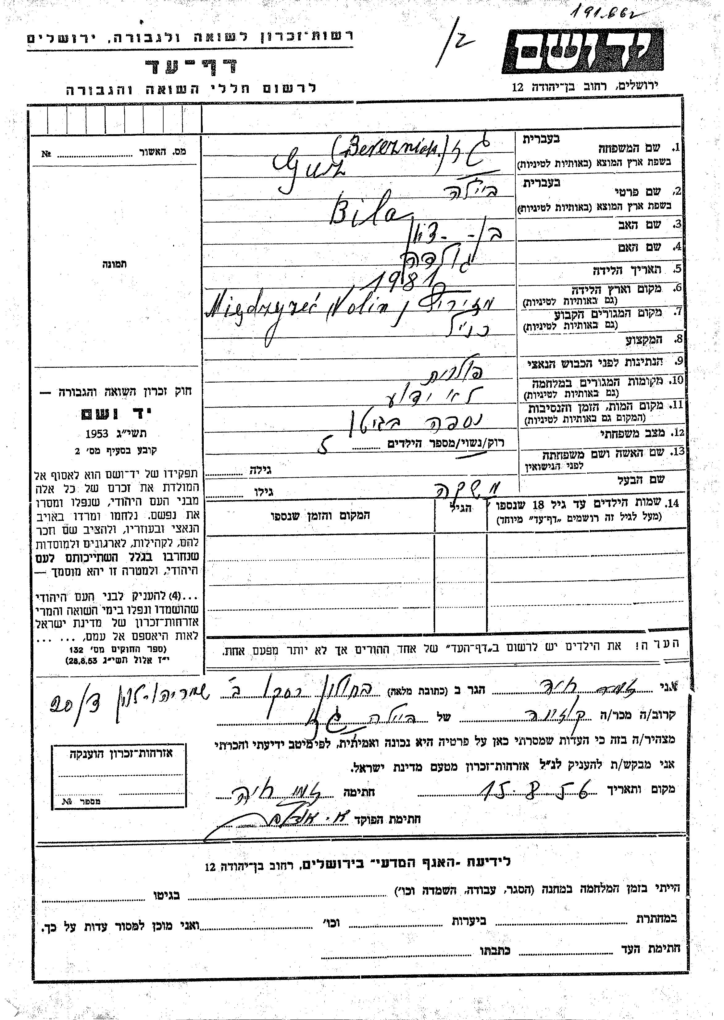 Била Гуз Березняк Гез, место рождения: Мендзыжеч Волынь, Польша. Отец: Бенцион, mать:Голда. Женат / замужем. Место жительства до войны: Мендзыжеч Волынь, Польша.