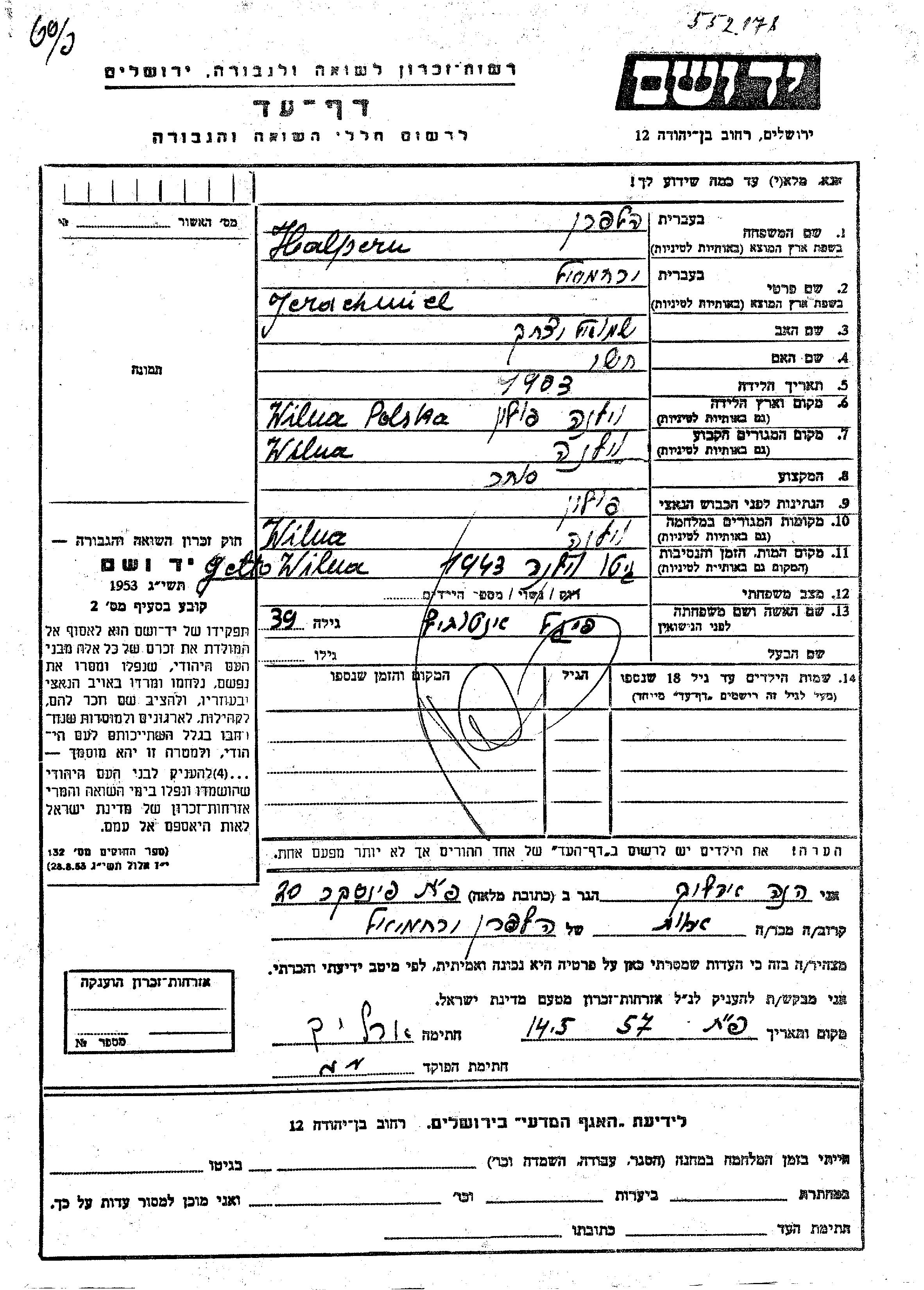 Иерахмиэль Хальперн, место рождения: Вильно, Польша. Отец: Шмуэль Ицхак, mать:Хаши. Торговец / торговка. Женат / замужем. Место жительства до войны: Вильно, Польша. Место во время войны: Вильно, Польша.