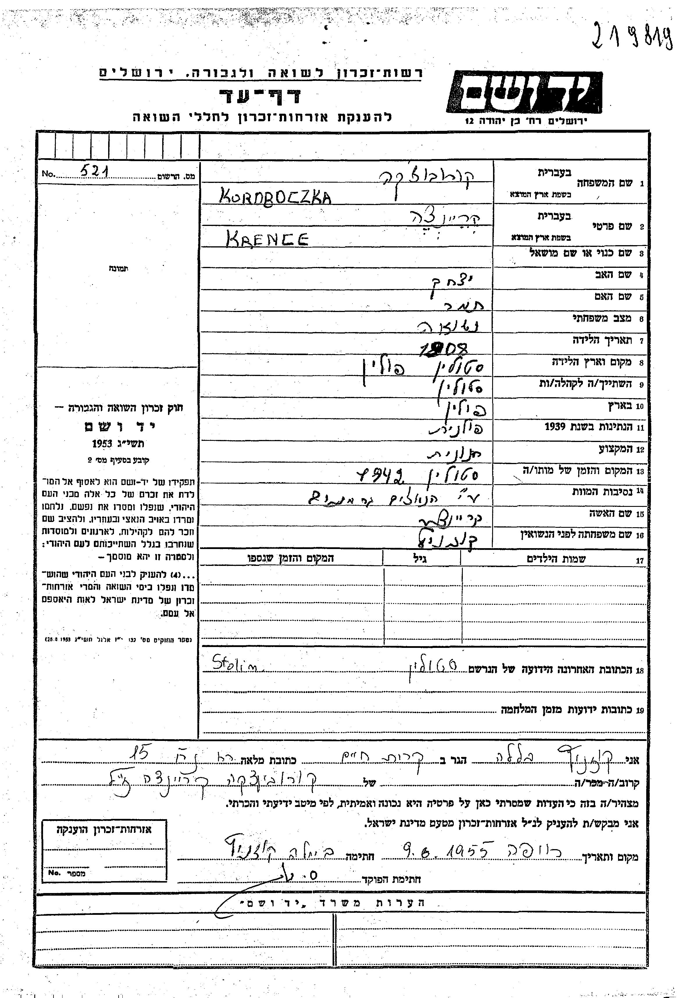 Крейна Коробочка, девичья фамилия Корнила, место рождения: Столин, Польша. Отец: Ицхак, mать:Тамар. Бакалейщик / бакалейщица. Женат / замужем. Место жительства до войны: Столин, Польша. Место во время войны: Столин, Польша.