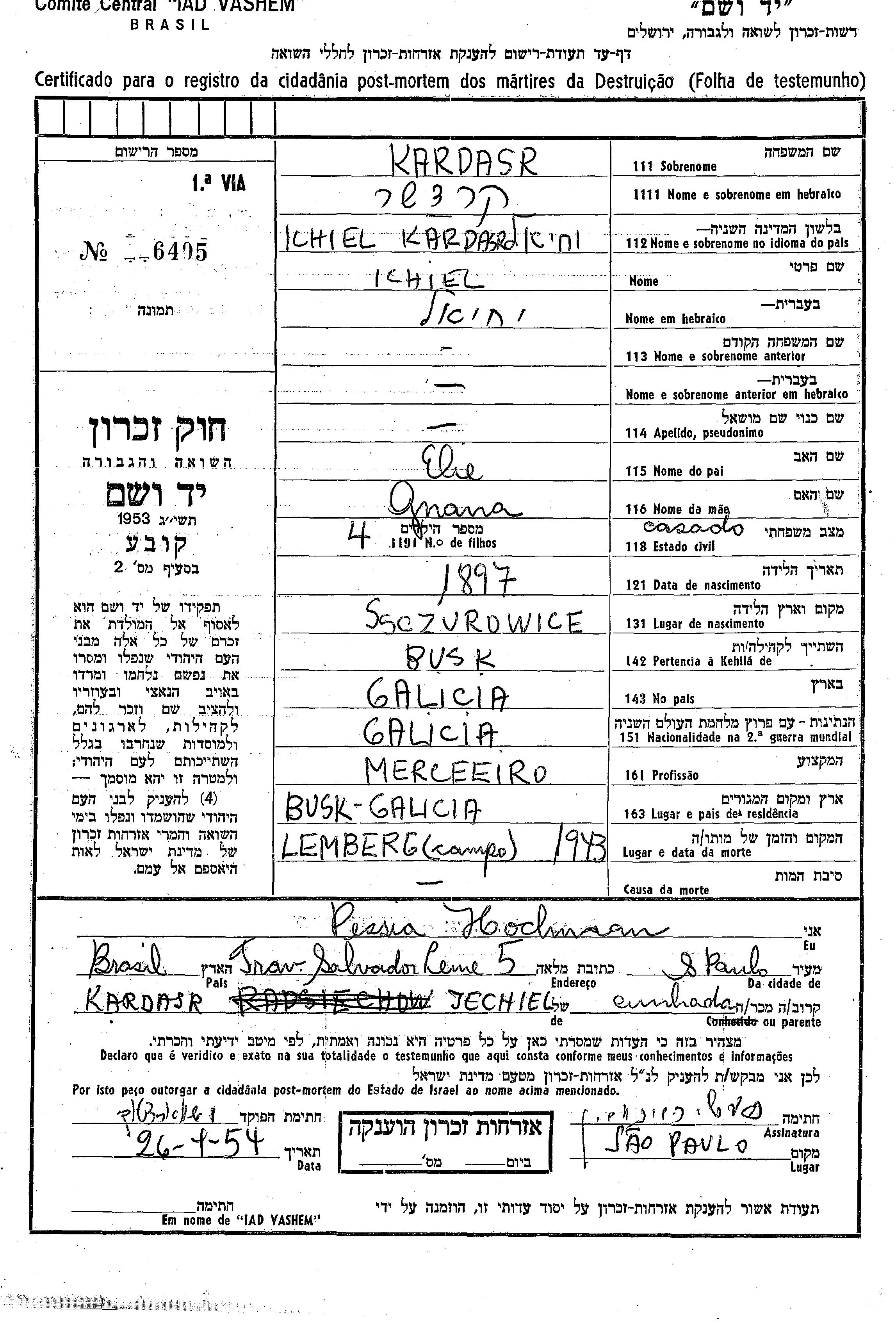 Ихиэль Кардаср, место рождения: Щуровичи, Польша. Отец: Эли, mать:Гнана. Merceria. Женат / замужем. Место жительства до войны: Буск, Польша. Место во время войны: Буск, Польша.