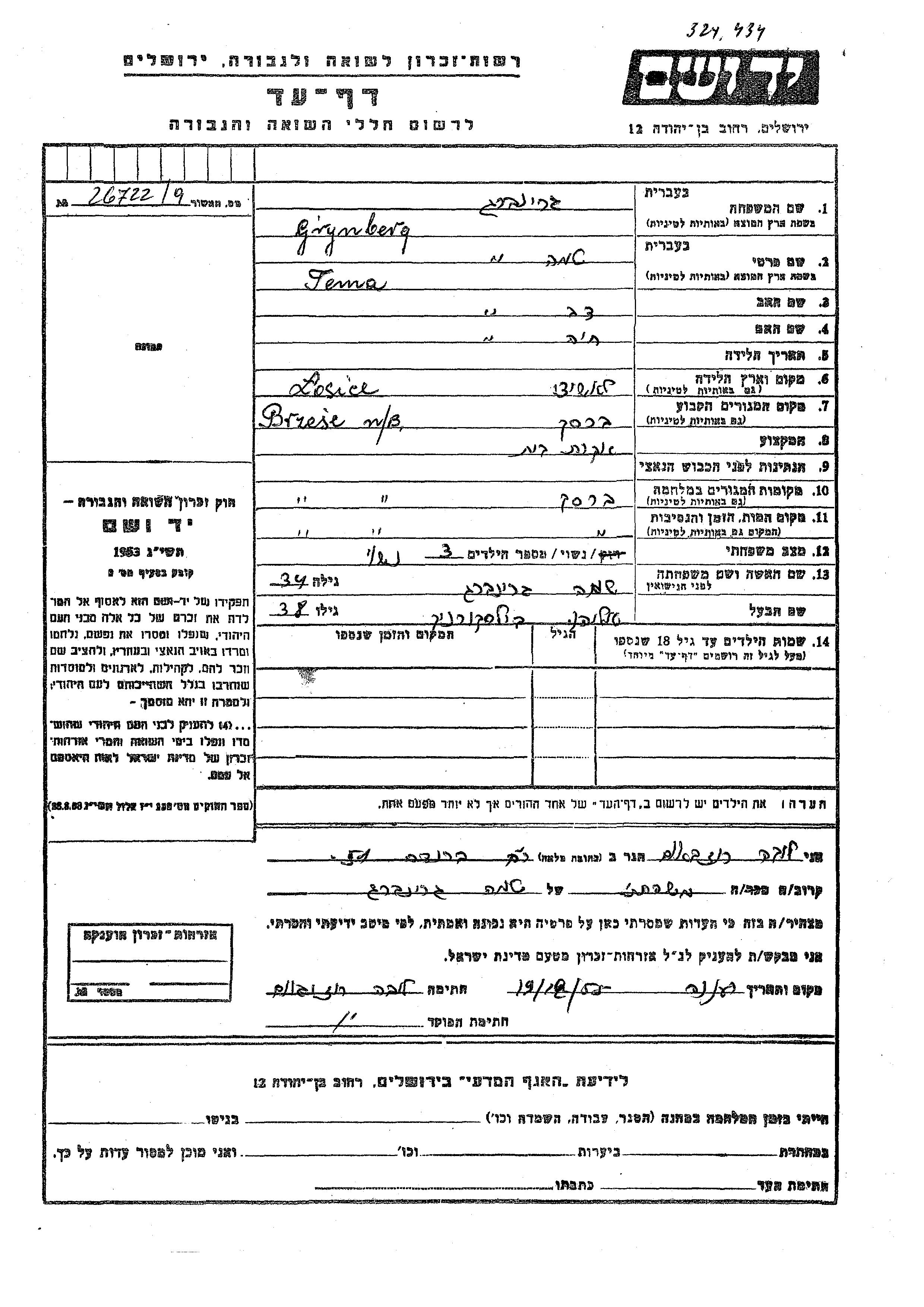 Тема Бялоскурник, девичья фамилия Гринберг, место рождения: Лосице, Польша. Отец: Дов, mать:Хая. Домохозяйка. Женат / замужем. Место жительства до войны: Брест Над Бугом, Польша. Место во время войны: Брест Над Бугом, Польша.