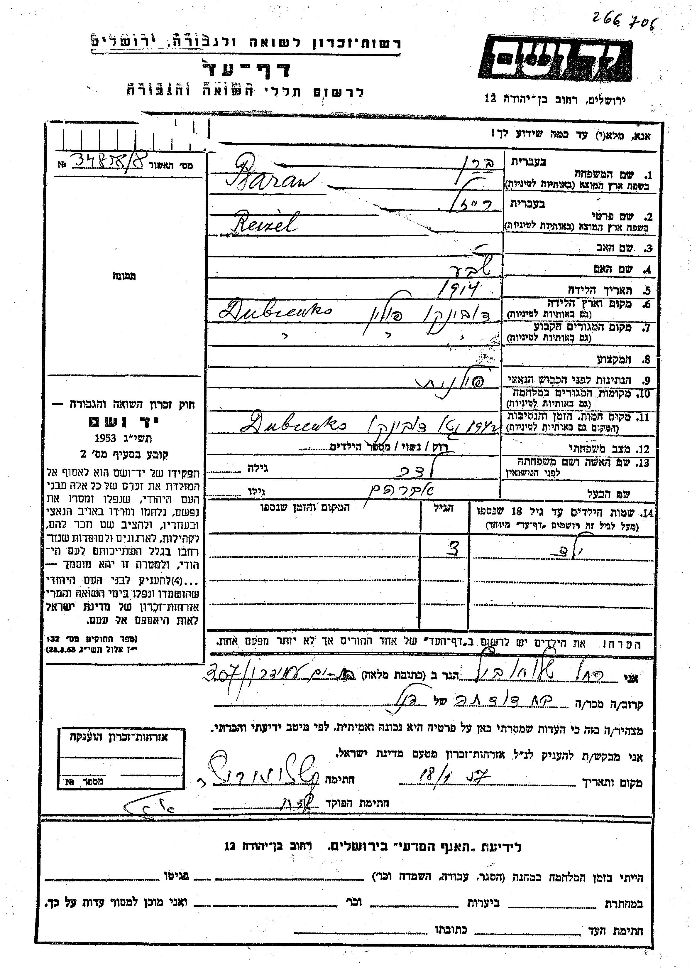 Яд Вашем - Листы свидетельских показаний Мемориального фонда