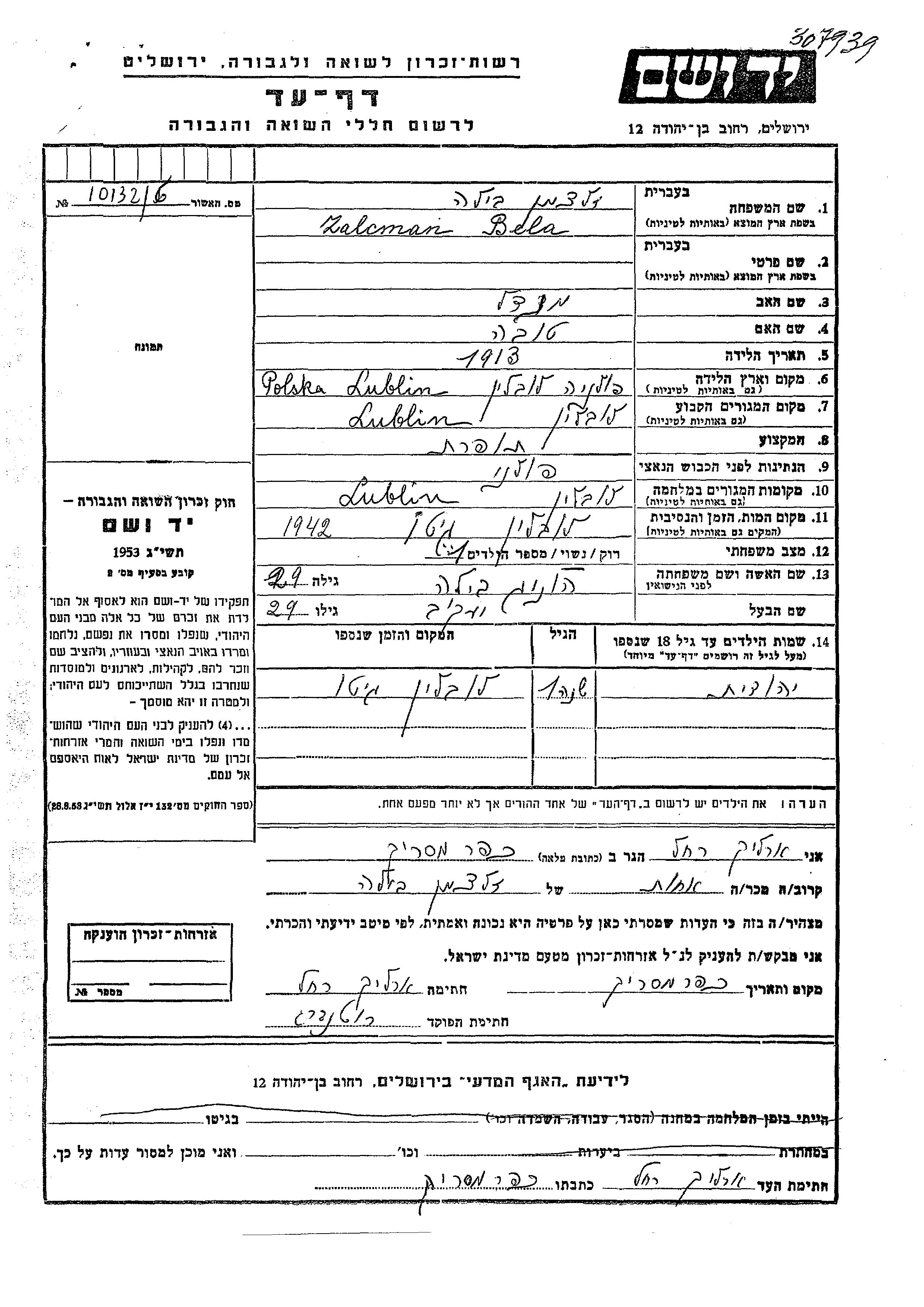 Зальцман Иегудит Люблин, Польша Лист свидетельских показаний