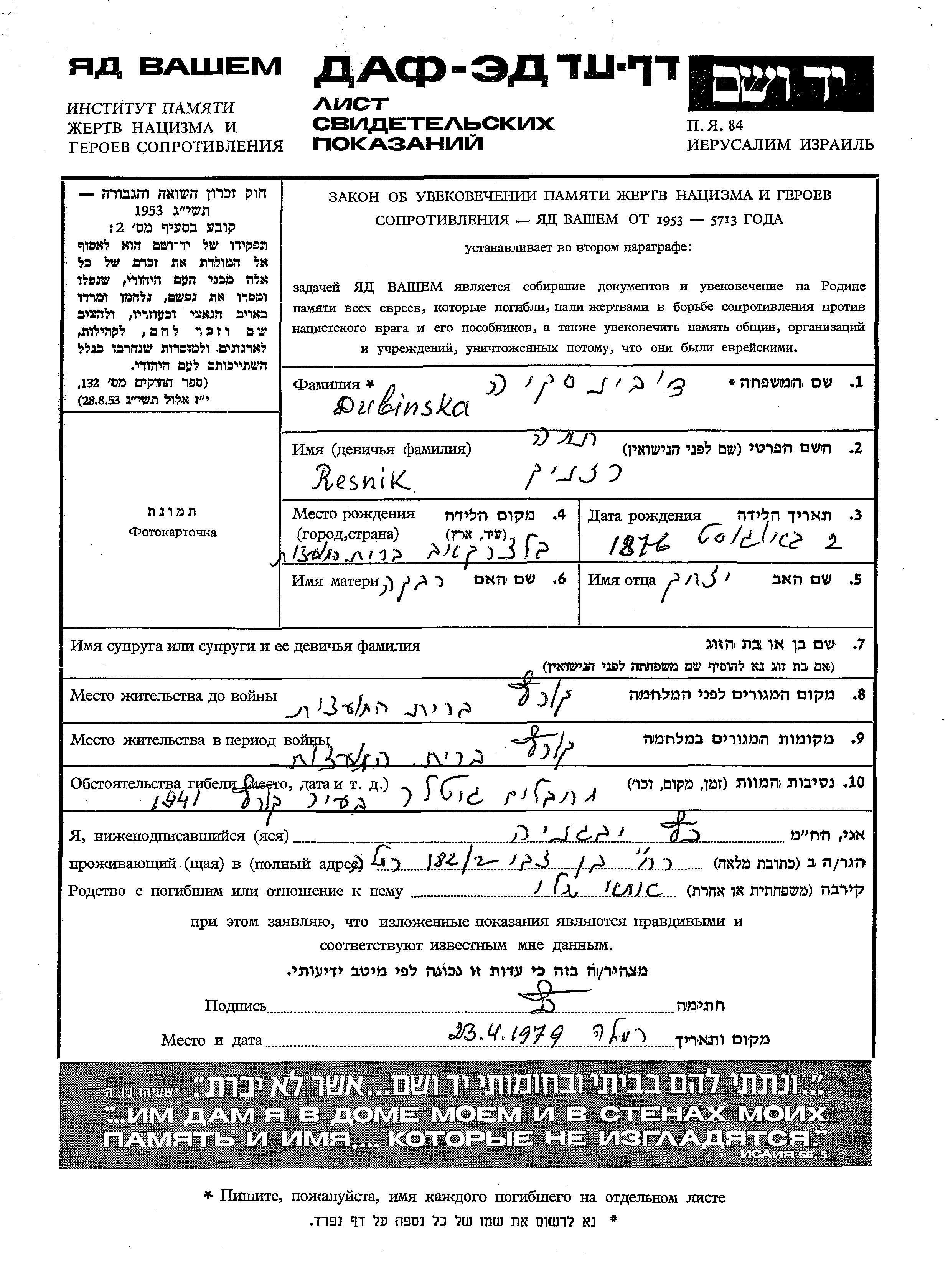 Тама Дубинска, девичья фамилия Ресник, место рождения: Белая Церковь, Украина (СССР). Отец: Ицхак, mать:Ривка. Женат / замужем. Место жительства до войны: Корз, Литва. Место во время войны: Корз, Литва.