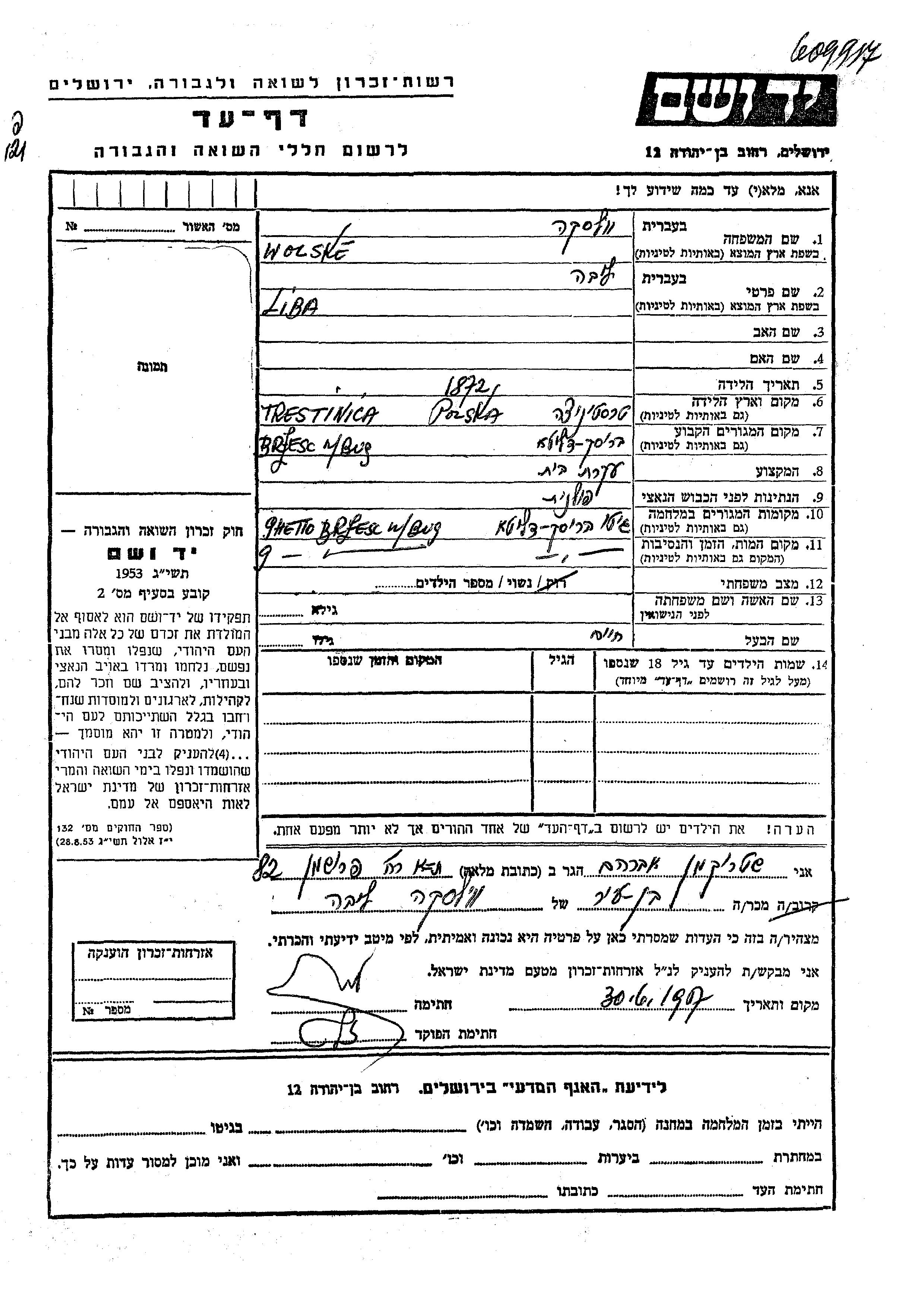 Либа Вольске, место рождения: Troscianica, Польша. Домохозяйка. Женат / замужем. Место жительства до войны: Брест Над Бугом, Польша. Место во время войны: Брест Над Бугом, Польша.
