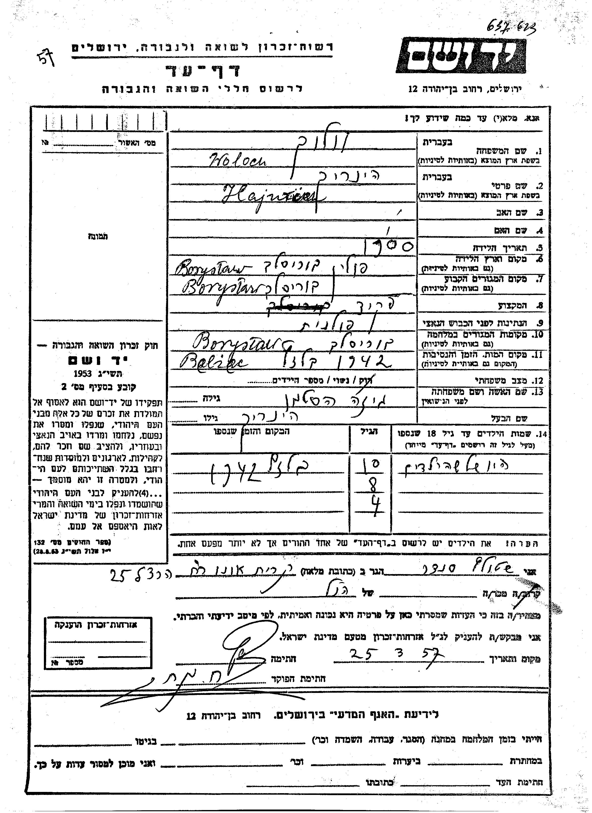 Яд Вашем - Листы свидетельских показаний Мемориального фонда