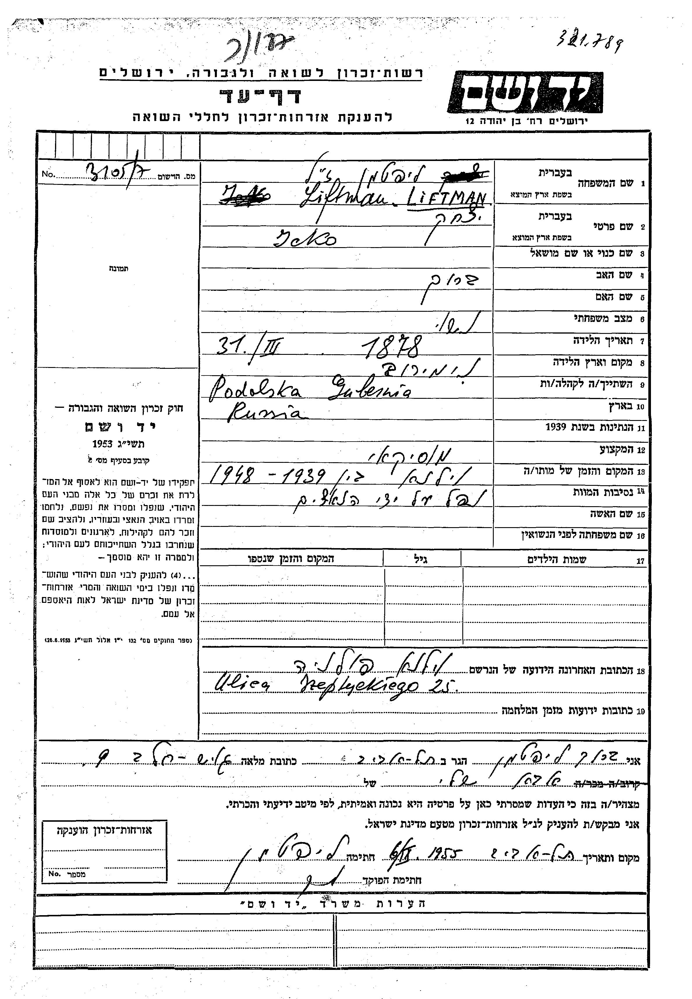 Лифтман Липстман Ицко 1878 Вильно, Польша Лист свидетельских показаний