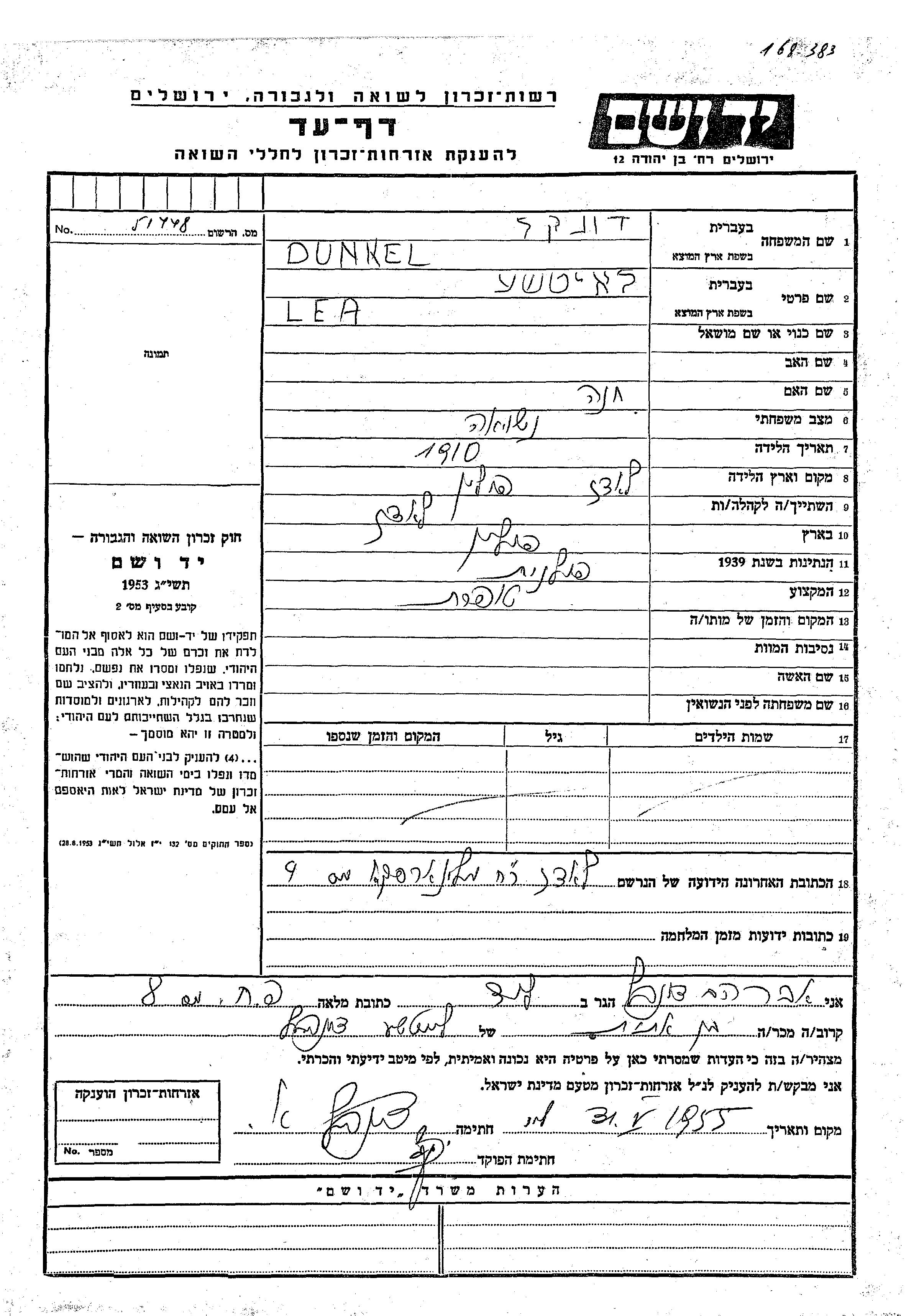 Лея Дункель, место рождения: Лодзь, Польша.Mать:Хана. Швея. Женат / замужем. Место жительства до войны: Лодзь, Польша. Место во время войны: Лодзь, Польша.
