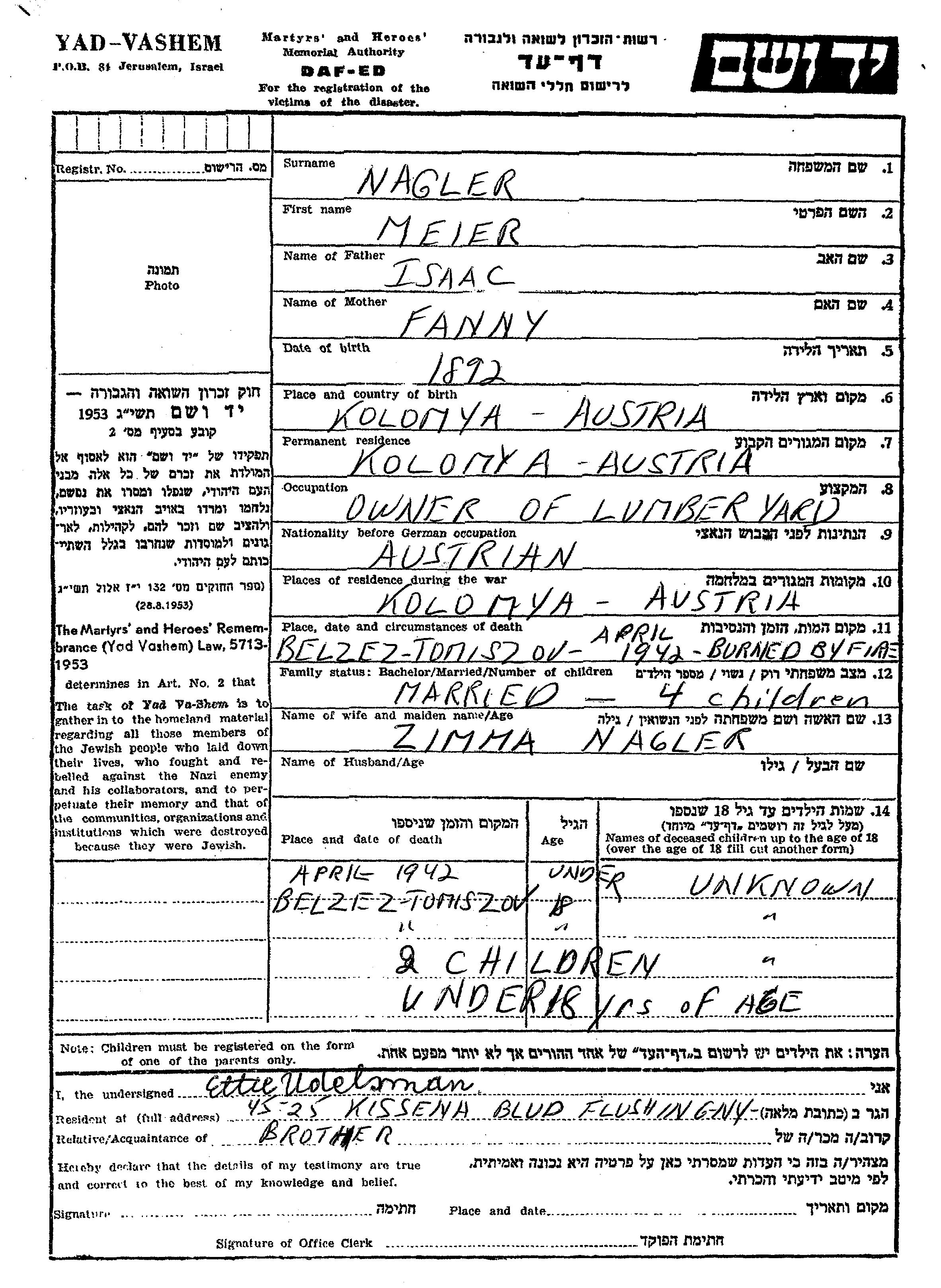 Наглер Имя неизвестно Коломыя, Польша Лист свидетельских показаний