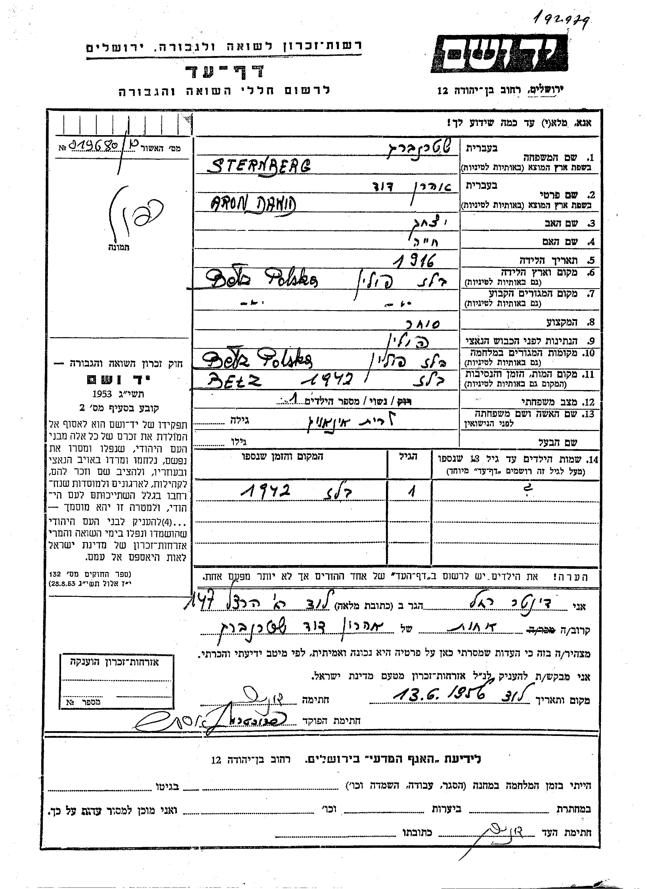 Имя неизвестно Штернберг родился/родилась Арон Давид девичья фамилия Эйног. Ребенок. Место жительства до войны: Белз, Польша. Место во время войны: Белз, Польша.