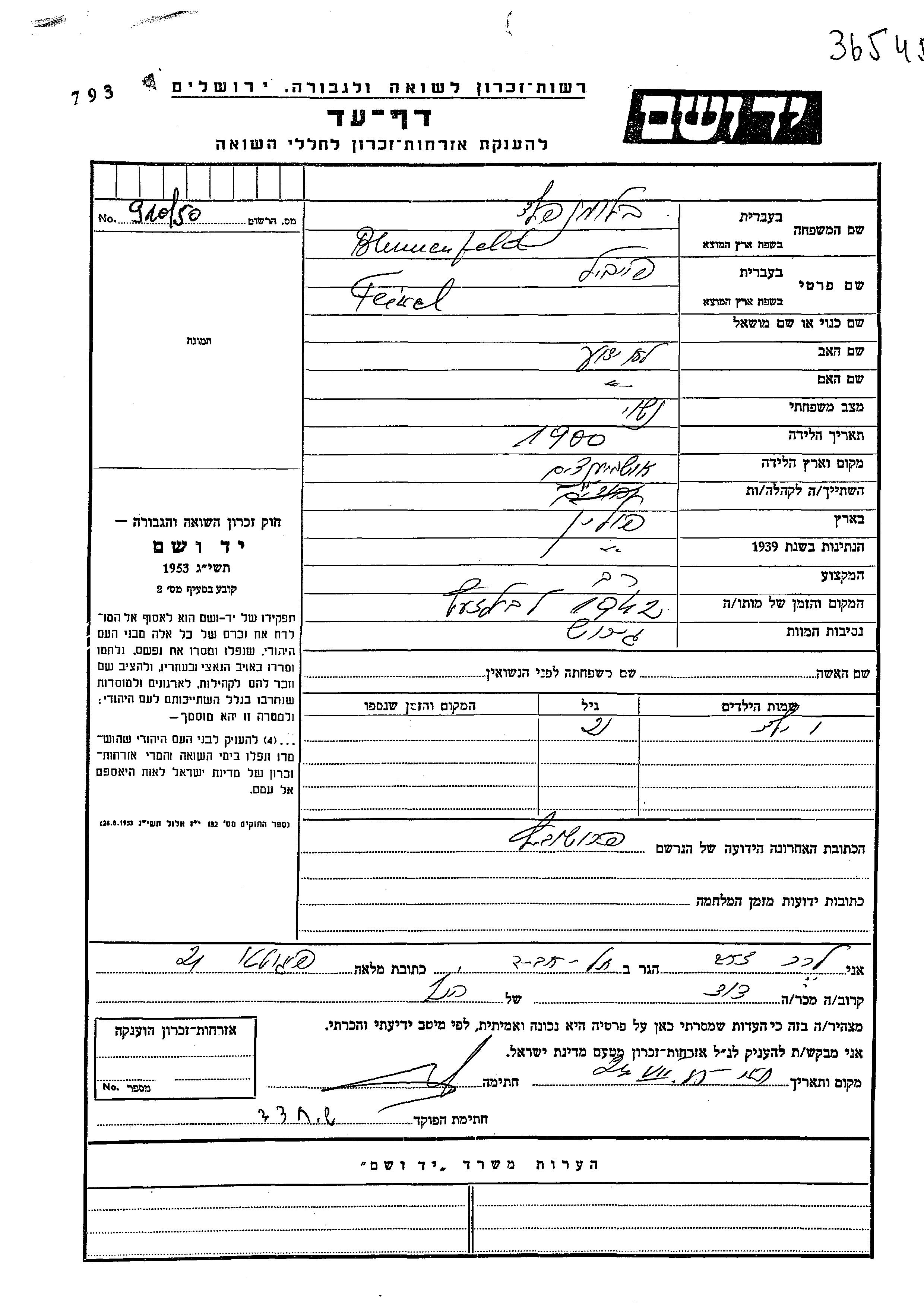 Блюменфельд Имя неизвестно Прошовице, Польша Лист свидетельских показаний