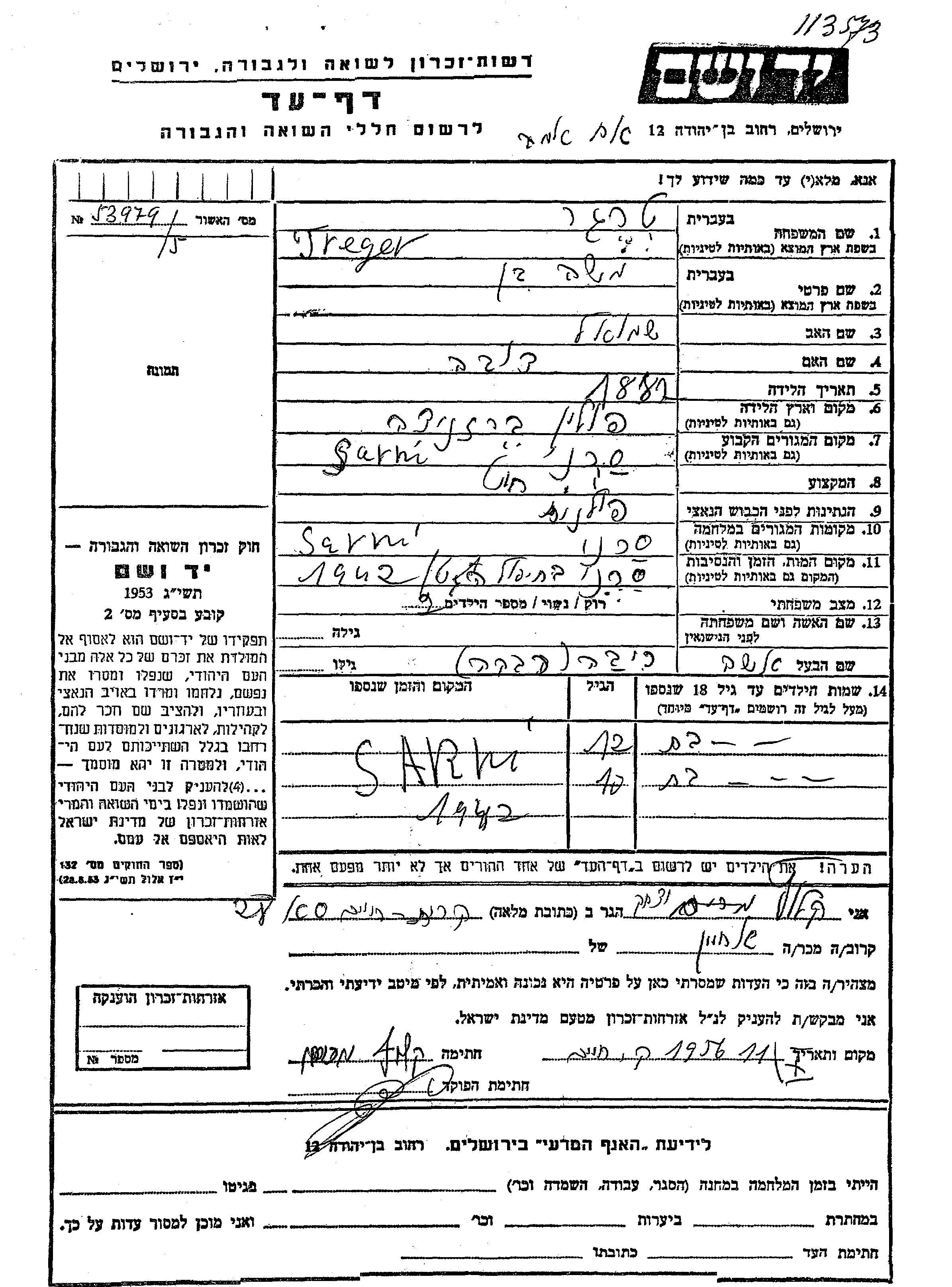 Трегер Имя неизвестно Сарны, Польша Лист свидетельских показаний