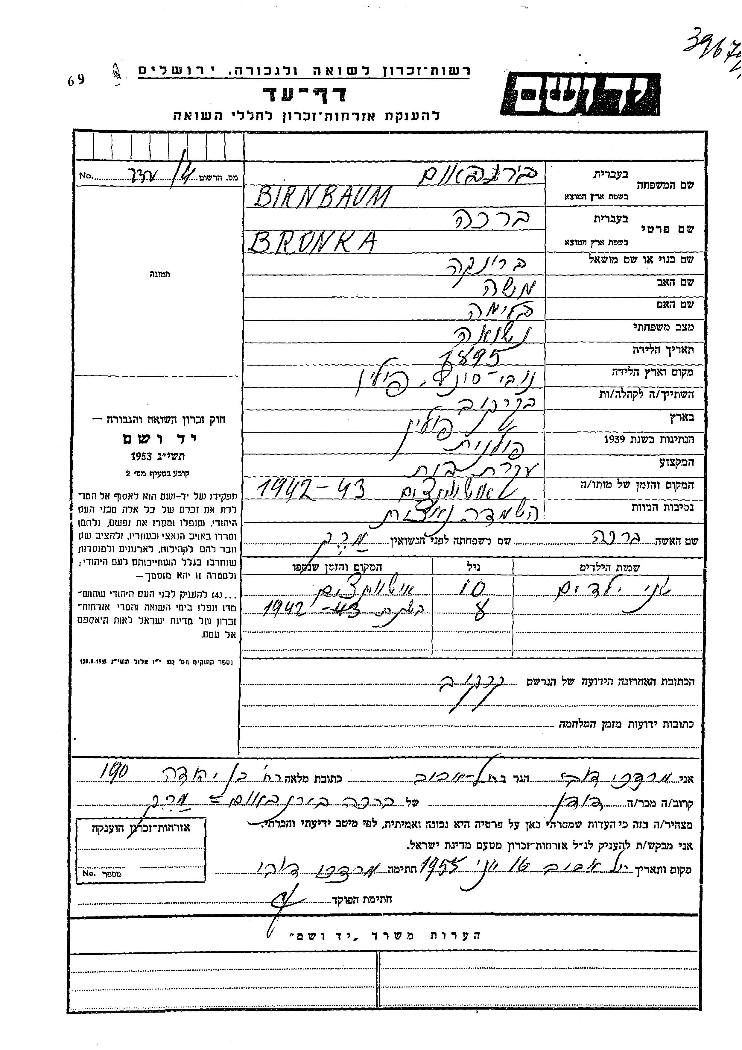 Бирнбаум Имя неизвестно Краков, Польша Лист свидетельских показаний