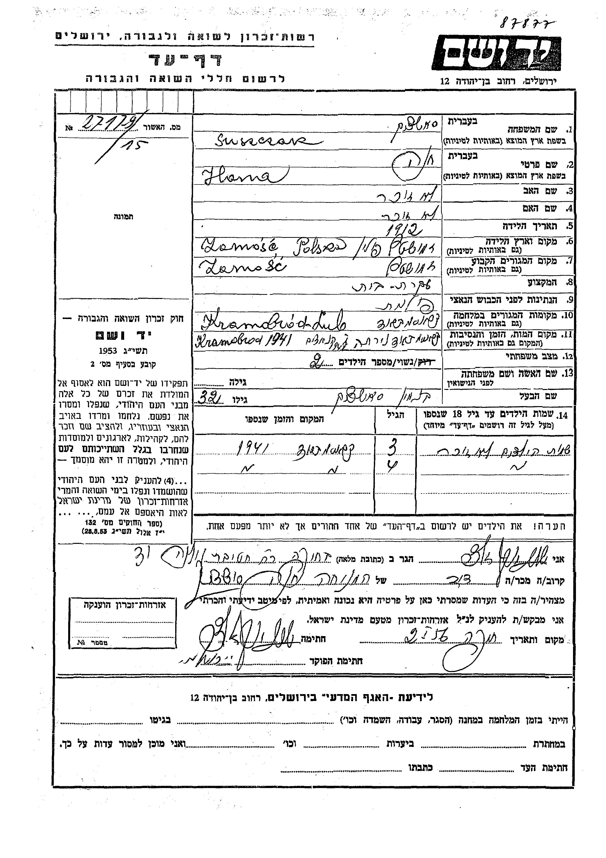 Сущак Имя неизвестно Замосць, Польша Лист свидетельских показаний