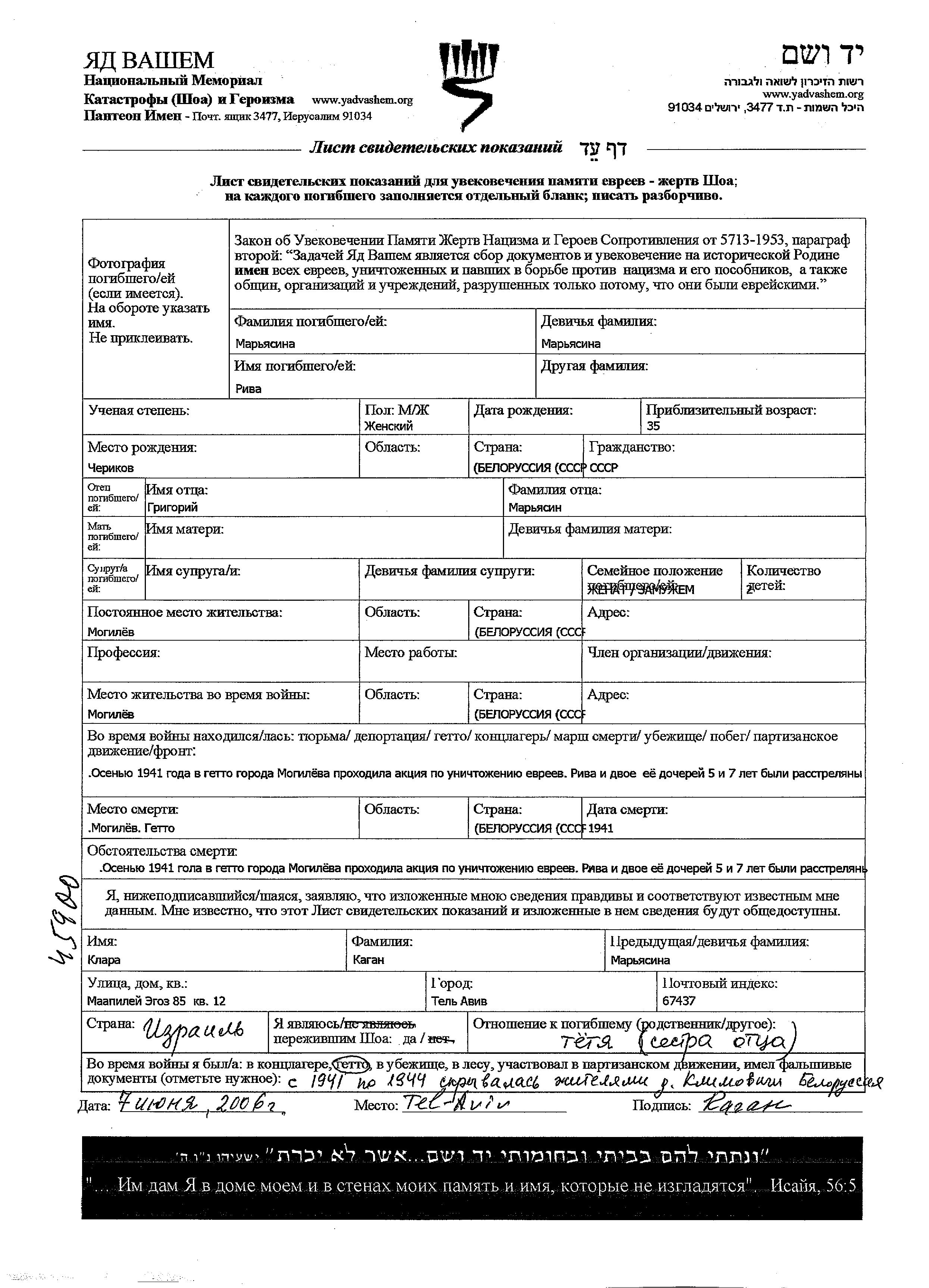 Марьясина Имя неизвестно Могилёв, Белоруссия (СССР) Лист свидетельских показаний