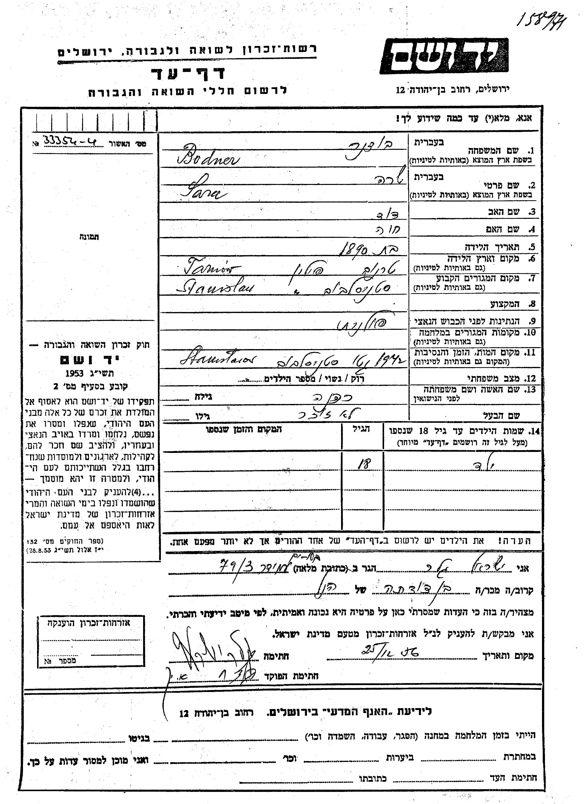 Боднер Имя неизвестно Станислау, Польша Лист свидетельских показаний